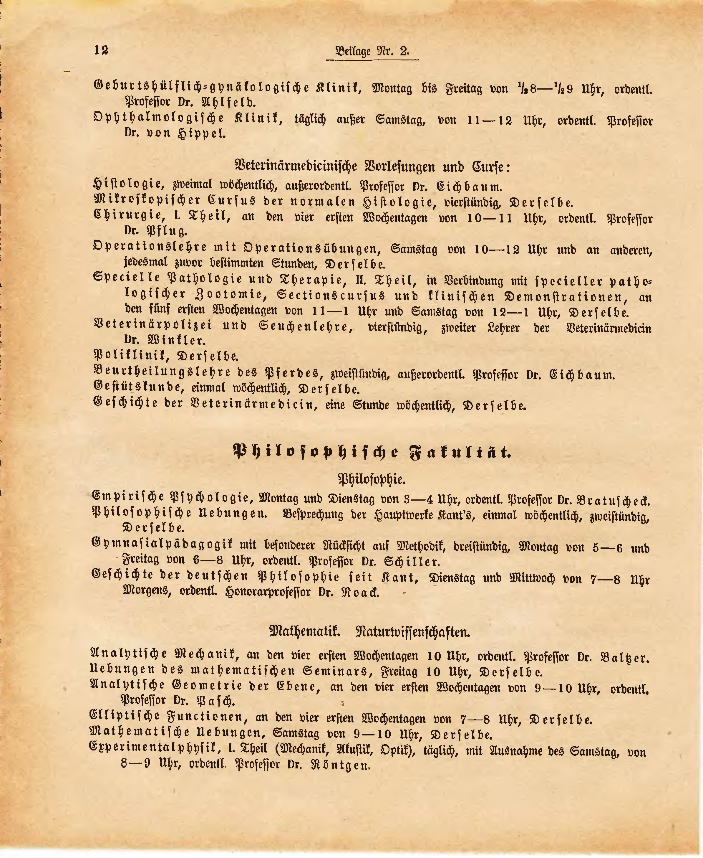 Experimentalphysik, I. Theil (Mechanik, Akustik, Optik), täglich, mit Ausnahme des Samstag, von 8-9 Uhr, ordentl. Professor Dr. Röntgen.