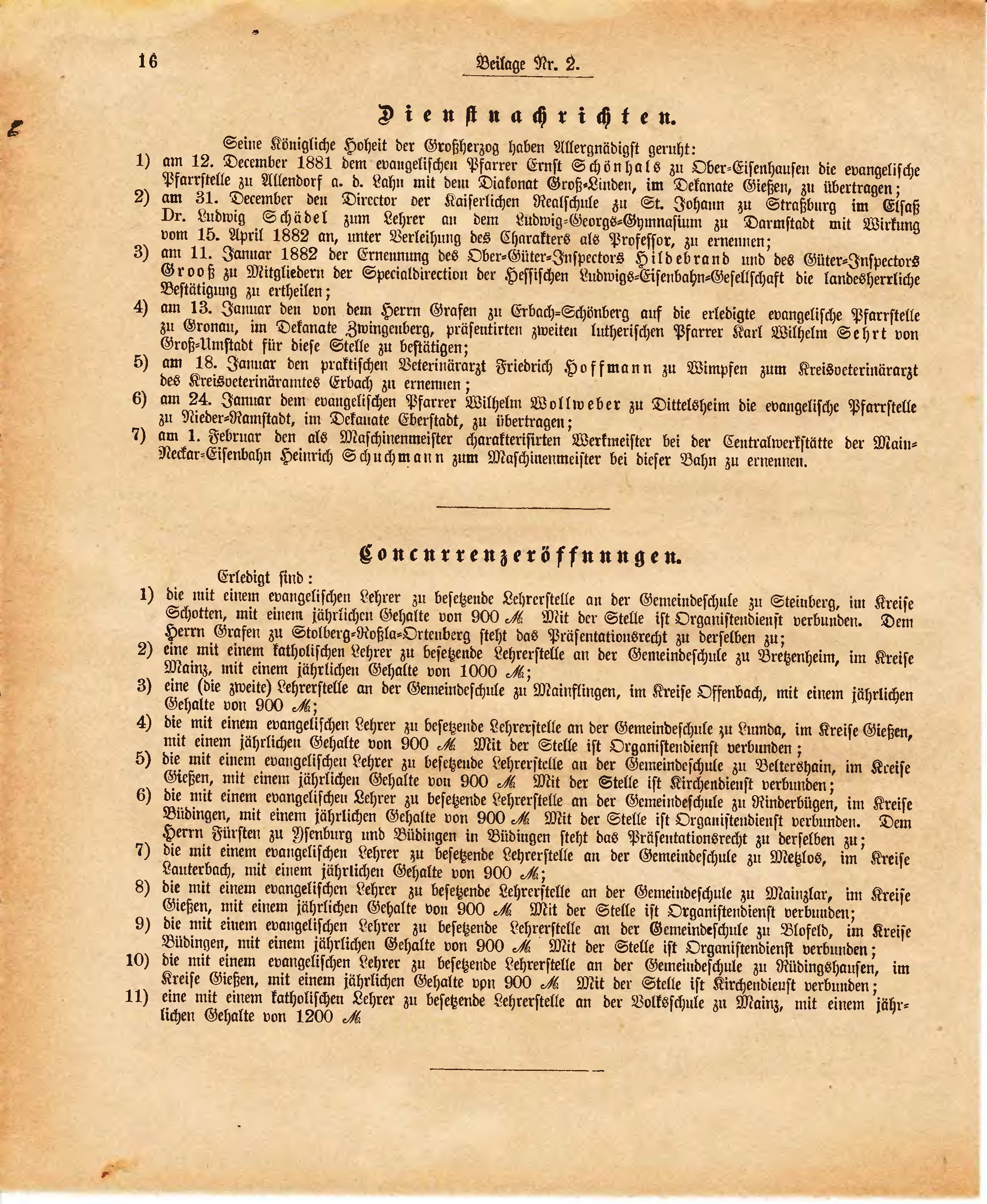 | 2) | am 31. December den Director der Kaiserlichen Realschule zu St. Johann zu Straßburg im Elsaß Dr. Ludwig Schädel zum Lehrer an dem Ludwig-Georgs-Gymnasium zu Darmstadt mit Wirkung vom 15. April 1882 an, unter Verleihung des Charakters als Professor, zu ernennen; |