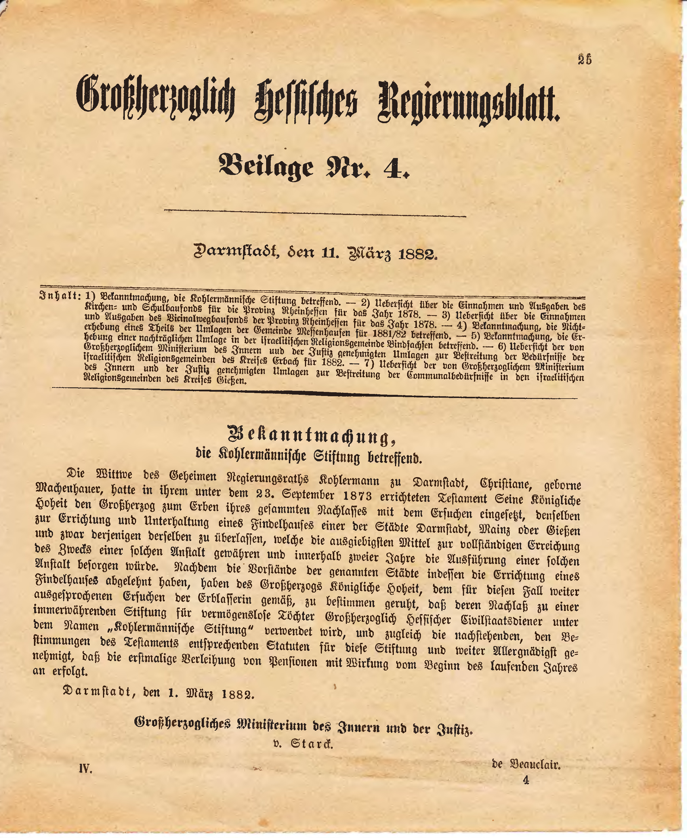 Die Wittwe des Geheimen Regierungsraths Kohlermann zu Darmstadt, Christiane, geborne Machenhauer, hatte in ihrem unter dem 23. September 1873 errichteten Testament Seine Königliche Hoheit den Großherzog zum Erben ihres gesammten Nachlasses mit dem Ersuchen eingesetzt, denselben zur Errichtung und Unterhaltung eines Findelhauses einer der Städte Darmstadt, Mainz oder Gießen und zwar derjenigen derselben zu überlassen, welche die ausgiebigsten Mittel zur vollständigen Erreichung des Zwecks einer solchen Anstalt gewähren und innerhalb zweier Jahre die Ausführung einer solchen Anstalt besorgen würde. Nachdem die Vorstände der genannten Städte indessen die Errichtung eines Findelhauses abgelehnt haben, haben des Großherzogs Königliche Hoheit, dem für diesen Fall weiter ausgesprochenen Ersuchen der Erblasserin gemäß, zu bestimmen geruht, daß deren Nachlaß zu einer immerwährenden Stiftung für vermögenslose Töchter Großherzoglich Hessischer Civilstaatsdiener unter dem Namen "Kohlermännische Stiftung" verwendet wird, und zugleich die nachstehenden, den Bestimmungen des Testaments entsprechenden Statuten für diese Stiftung und weiter Allergnädigst genehmigt, daß die erstmalige Verleihung von Pensionen mit Wirkung vom Beginn des laufenden Jahres an erfolgt.