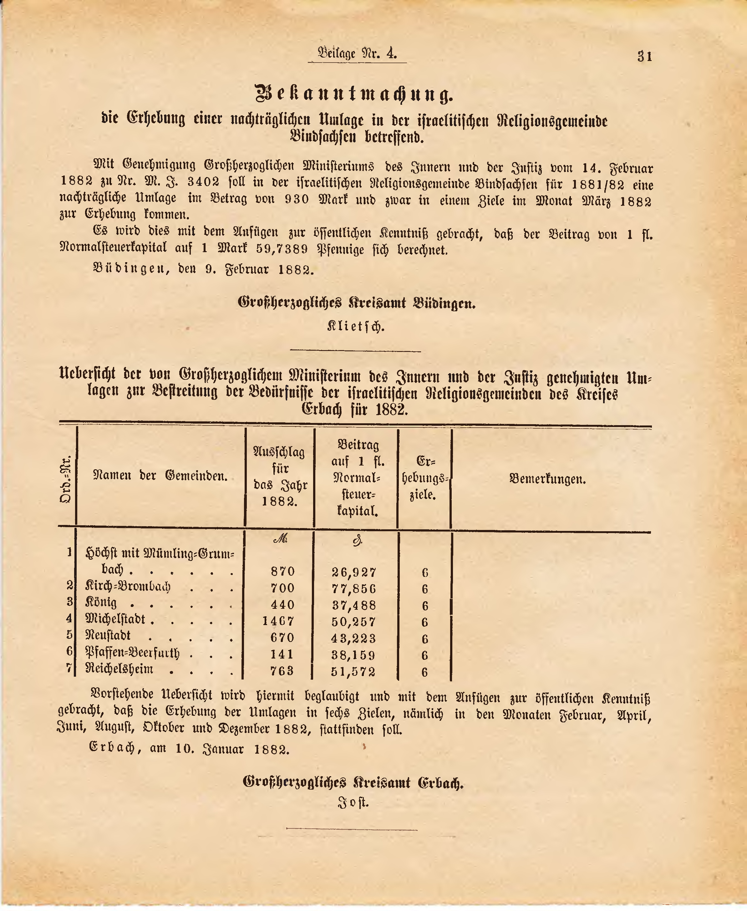Mit Genehmigung Großherzoglichen Ministeriums des Innern und der Justiz vom 14. Februar 1882 zu Nr. M. J. 3402 soll in der israelitischen Religionsgemeinde Bindsachsen für 1881/82 eine nachträgliche Umlage im Betrag von 930 Mark und zwar in einem Ziele im Monat März 1882 zur Erhebung kommen.