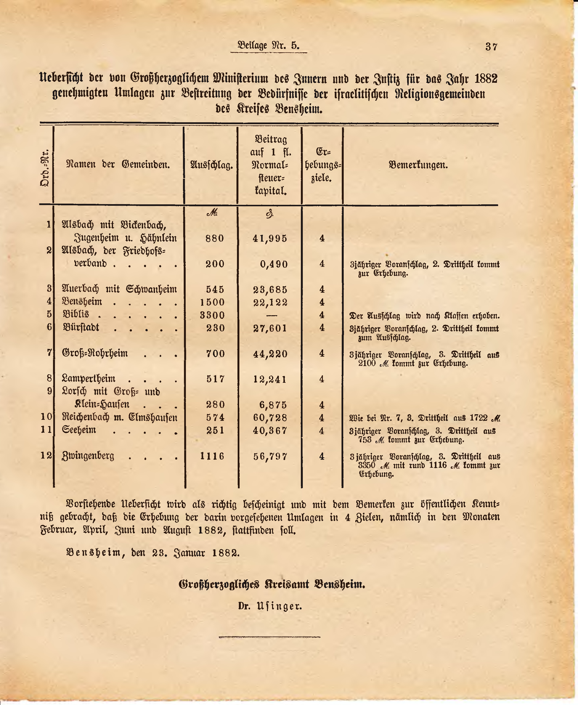 Uebersicht der von Großherzoglichem Ministerium des Innern und der Justiz für das Jahr 1882 genehmigten Umlagen zur Bestreitung der Bedürfnisse der israelitischen Religionsgemeinden des Kreises Bensheim.