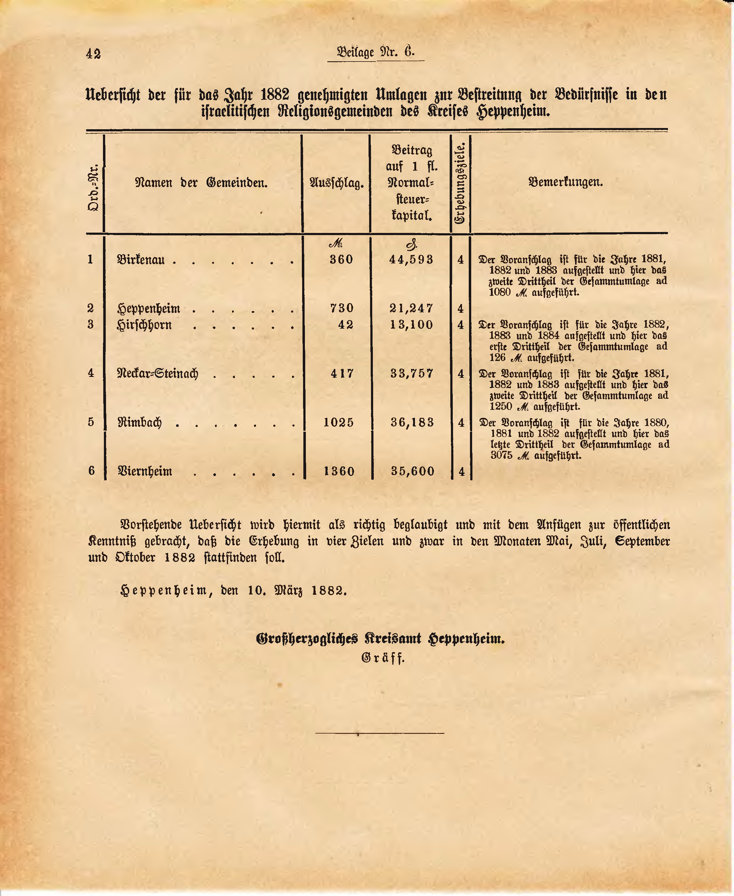 Uebersicht der für das Jahr 1882 genehmigten Umlagen zur Bestreitung der Bedürfnisse in den israelitischen Religionsgemeinden des Kreises Heppenheim.
