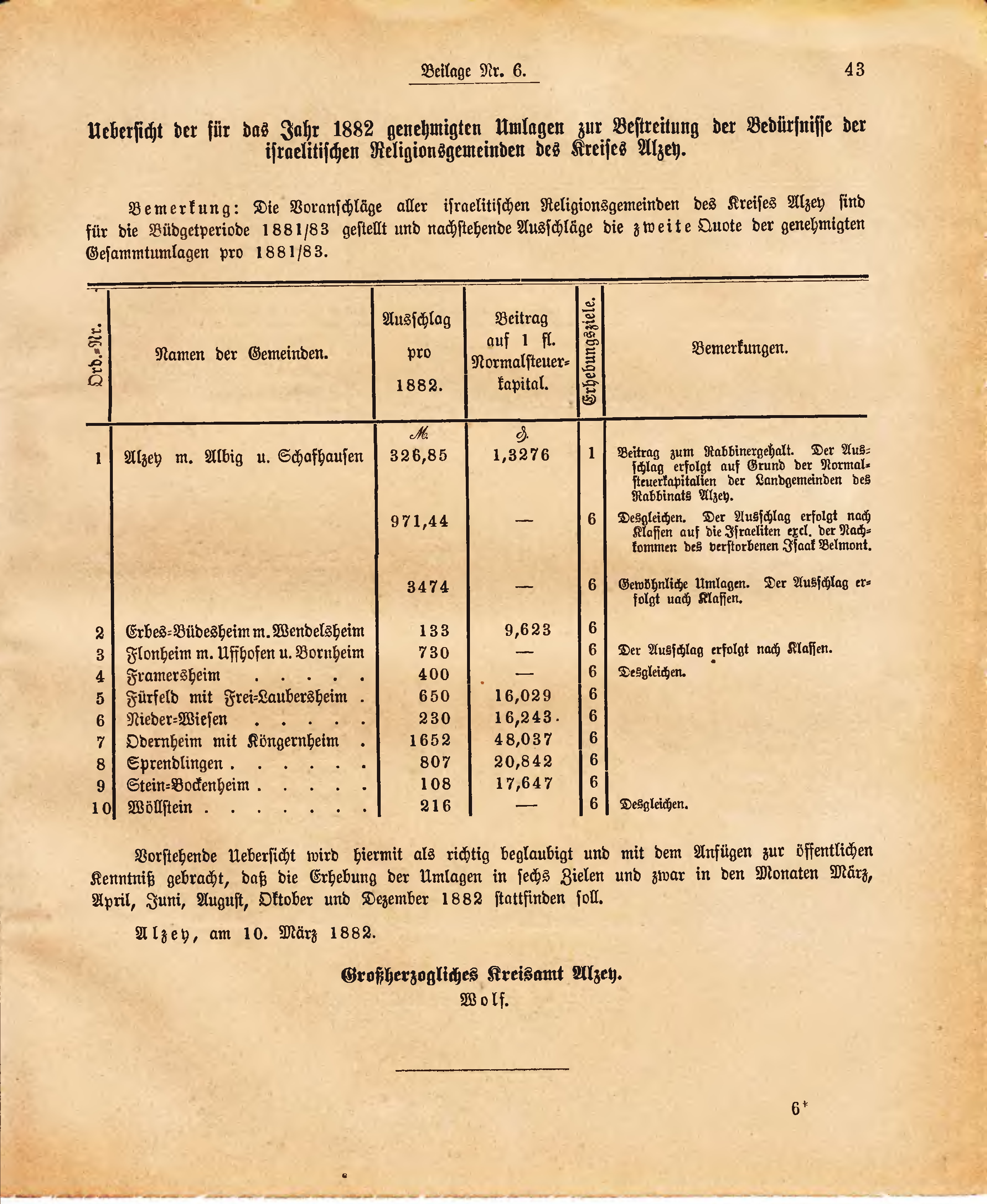 Uebersicht der für das Jahr 1882 genehmigten Umlagen zur Bestreitung der Bedürfnisse der israelitischen Religionsgemeinden des Kreises Alzey.