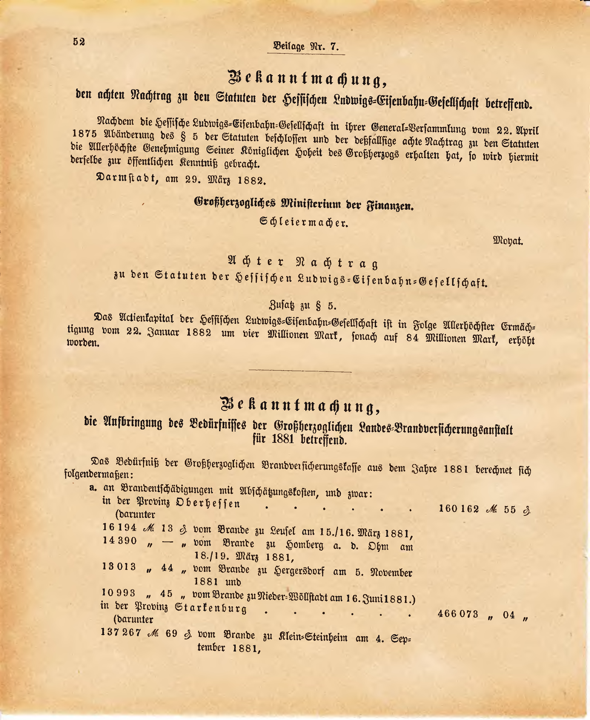 Das Actienkapital der Hessischen Ludwigs-Eisenbahn-Gesellschaft ist in Folge Allerhöchster Ermächtigung vom 22. Januar 1882 um vier Millionen Mark, sonach auf 84 Millionen Mark, erhöht worden.
