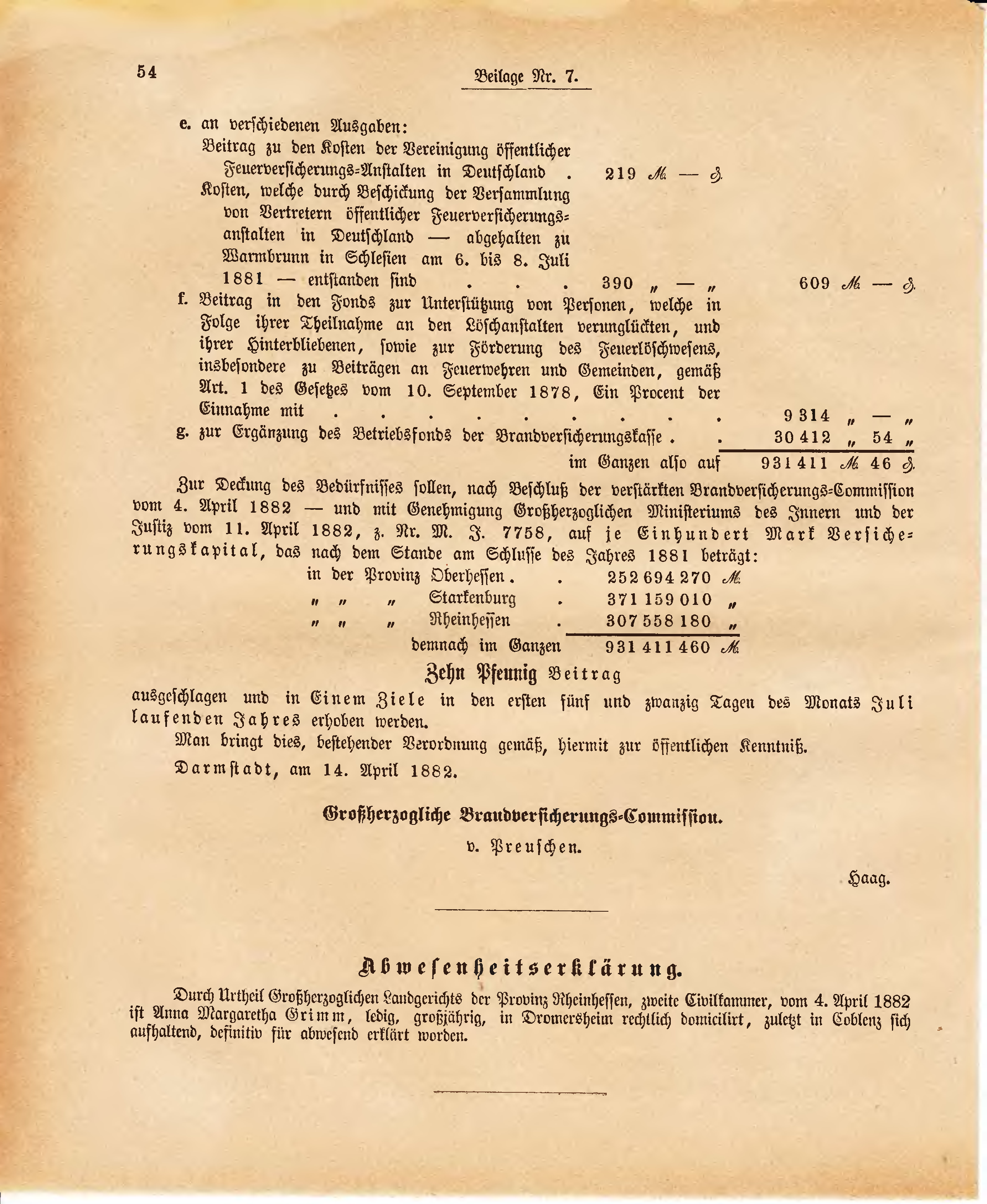 Zur Deckung des Bedürfnisses sollen, nach Beschluß der verstärkten Brandversicherungs-Commission vom 4. April 1882 - und mit Genehmigung Großherzoglichen Ministeriums des Innern und der Justiz vom 11. April 1882, z. Nr. M. J. 7758, auf je Einhundert Mark Versicherungskapital, das nach dem Stande am Schlusse des Jahres 1881 beträgt: