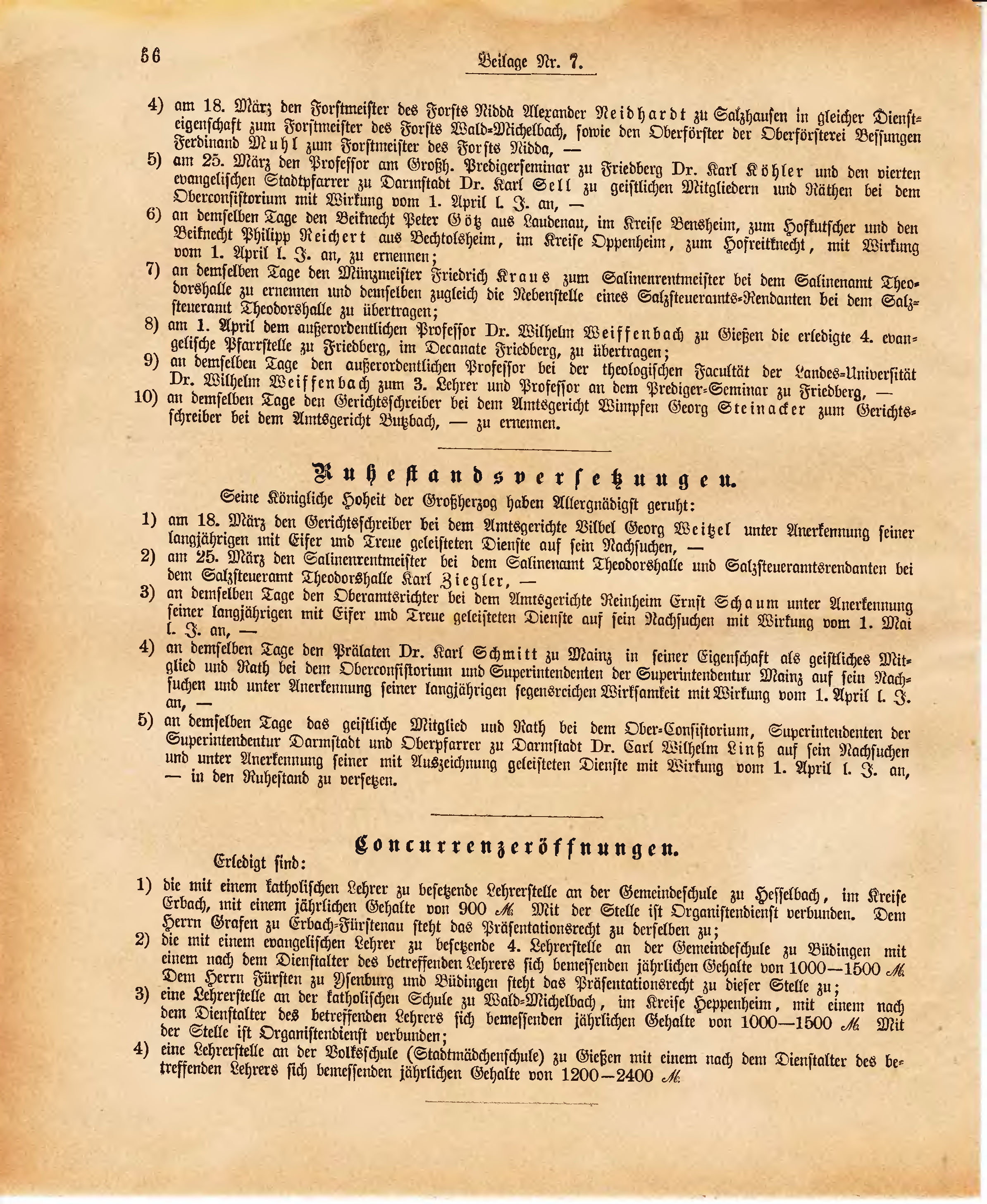 | 8) | am 1. April dem außerordentlichen Professor Dr. Wilhelm Weiffenbach zu Gießen die erledigte 4. evangelische Pfarrstelle zu Friedberg, im Decanate Friedberg, zu übertragen; |