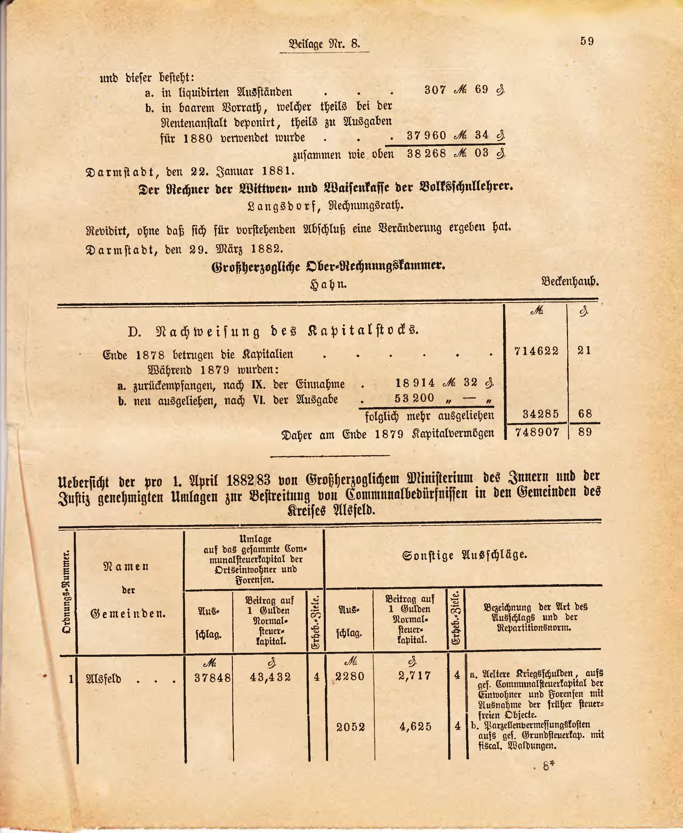 Uebersicht der pro 1. April 1882/83 von Großherzoglichem Ministerium des Innern und der Justiz genehmigten Umlagen zur Bestreitung von Communalbedürfnissen in den Gemeinden des Kreises Alsfeld.