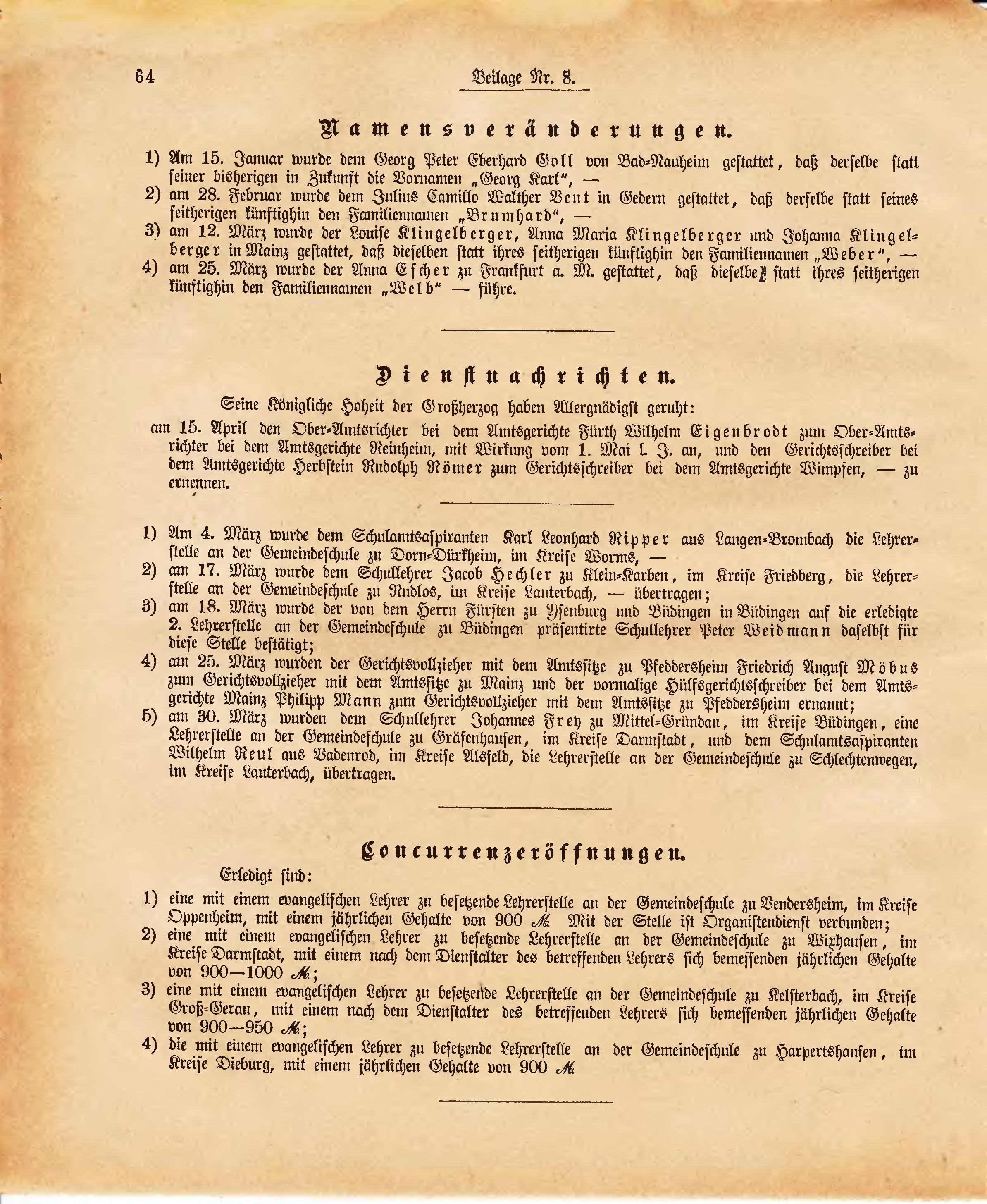 | 3) | am 12. März wurde der Louise Klingelberger, Anna Maria Klingelberger und Johanna Klingelberger in Mainz gestattet, daß dieselben statt ihres seitherigen künftighin den Familiennamen "Weber", - |