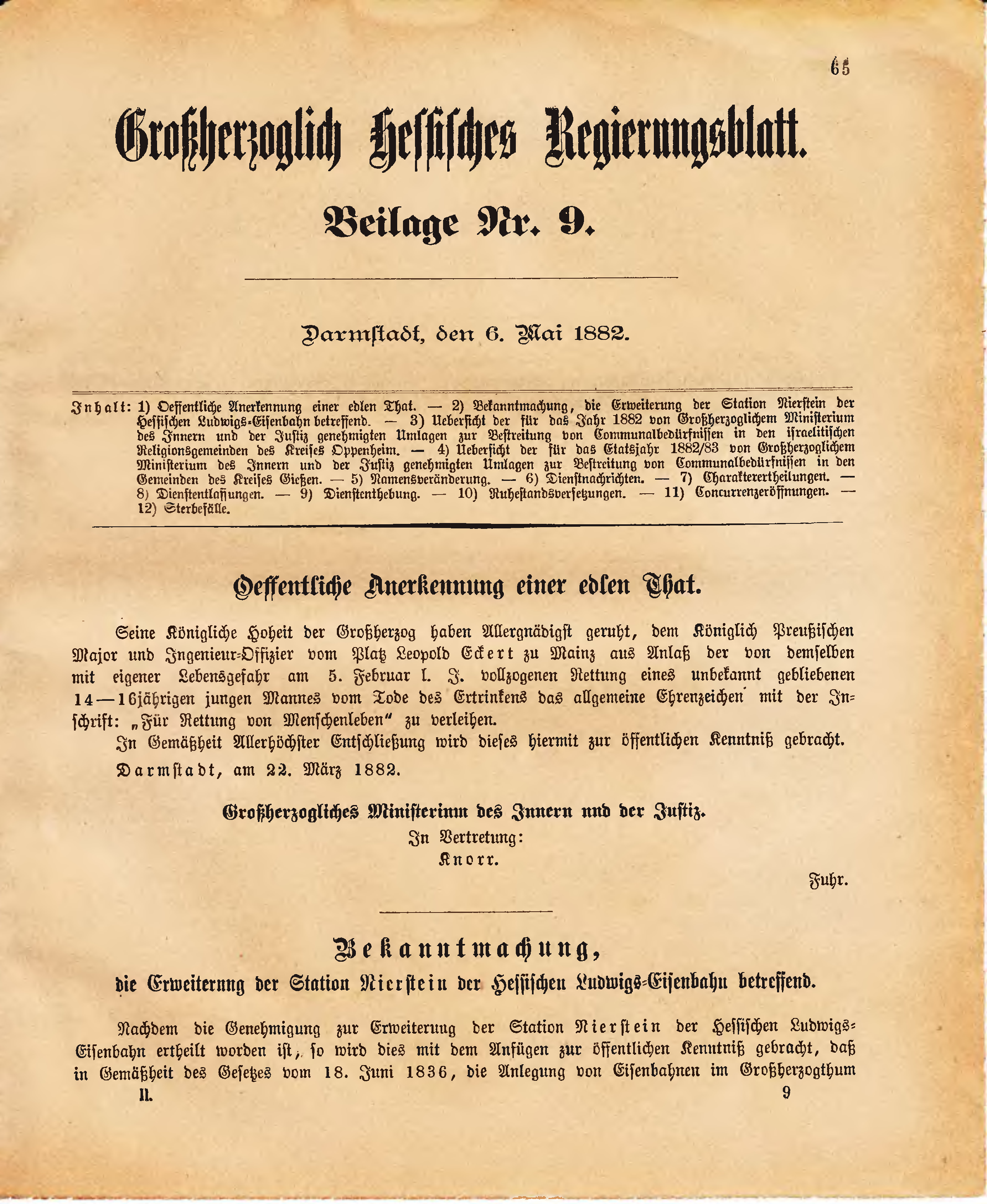 | Inhalt: | 1) Oeffentliche Anerkennung einer edlen That. - 2) Bekanntmachung, die Erweiterung der Station Nierstein der Hessischen Ludwigs-Eisenbahn betreffend. - 3) Uebersicht der für das Jahr 1882 von Großherzoglichem Ministerium des Innern und der Justiz genehmigten Umlagen zur Bestreitung von Communalbedürfnissen in den israelitischen Religionsgemeinden des Kreises Oppenheim. - 4) Uebersicht der für das Etatsjahr 1882/83 von Großherzoglichem Ministerium des Innern und der Justiz genehmigten Umlagen zur Bestreitung von Communalbedürfnissen in den Gemeinden des Kreises Gießen. - 5) Namensveränderung. - 6) Dienstnachrichten. - 7) Charakterertheilungen. - 8) Dienstentlassungen. - 9) Dienstenthebung. - 10) Ruhestandsversetzungen. - 11) Concurrenzeröffnungen. - 12) Sterbefälle. |
