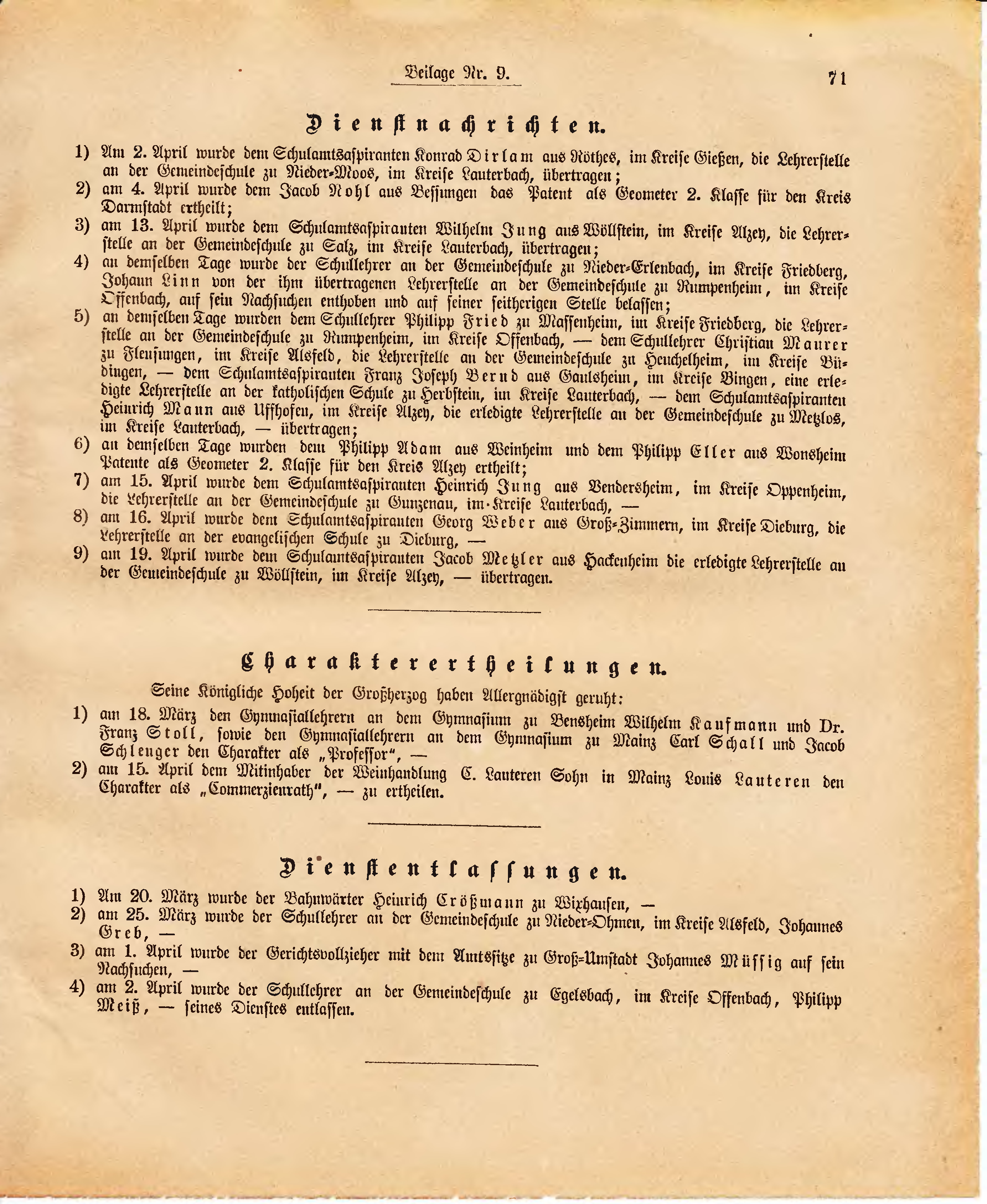 | 7) | am 15. April wurde dem Schulamtsaspiranten Heinrich Jung aus Vendersheim, im Kreise Oppenheim, die Lehrerstelle an der Gemeindeschule zu Gunzenau, im Kreise Lauterbach, - |