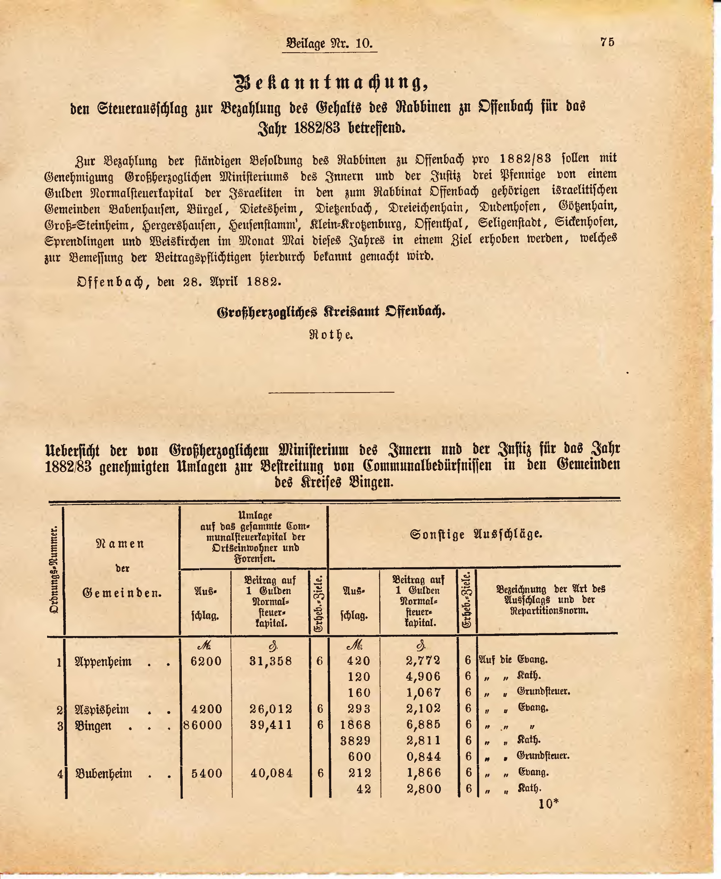 Zur Bezahlung der ständigen Besoldung des Rabbinen zu Offenbach pro 1882/83 sollen mit Genehmigung Großherzoglichen Ministeriums des Innern und der Justiz drei Pfennige von einem Gulden Normalsteuerkapital der Israeliten in den zum Rabbinat Offenbach gehörigen israelitischen Gemeinden Babenhausen, Bürgel, Dietesheim, Dietzenbach, Dreieichenhain, Dudenhofen, Götzenhain, Groß-Steinheim, Hergershausen, Heusenstamm, Klein-Krotzenburg, Offenthal, Seligenstadt, Sickenhofen, Sprendlingen und Weiskirchen im Monat Mai dieses Jahres in einem Ziel erhoben werden, welches zur Bemessung der Beitragspflichtigen hierdurch bekannt gemacht wird.