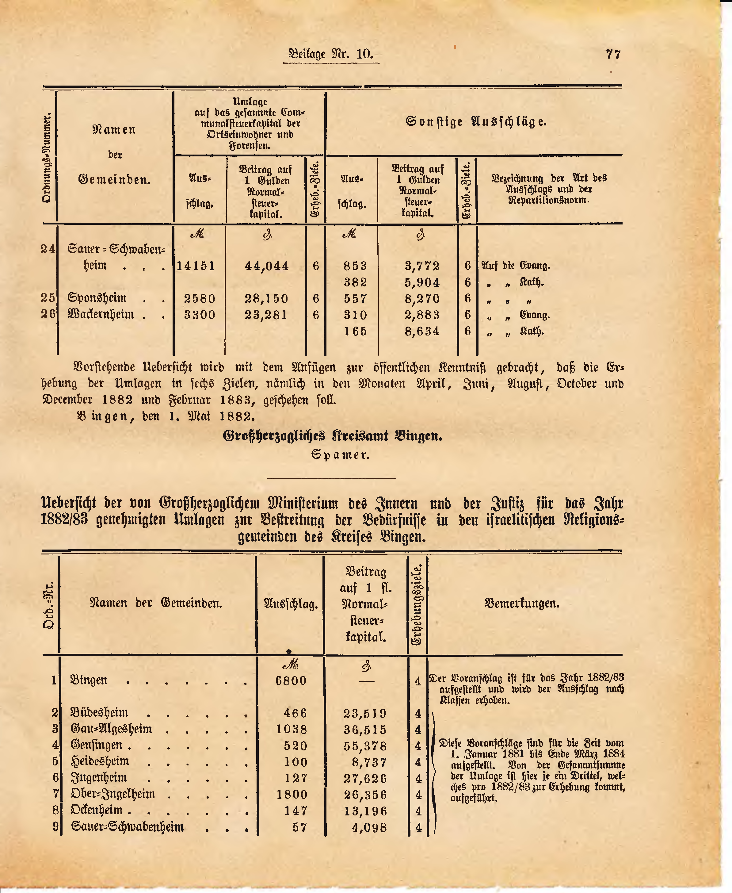 Uebersicht der von Großherzoglichem Ministerium des Innern und der Justiz für das Jahr 1882/83 genehmigten Umlagen zur Bestreitung der Bedürfnisse in den israelitischen Religionsgemeinden des Kreises Bingen.