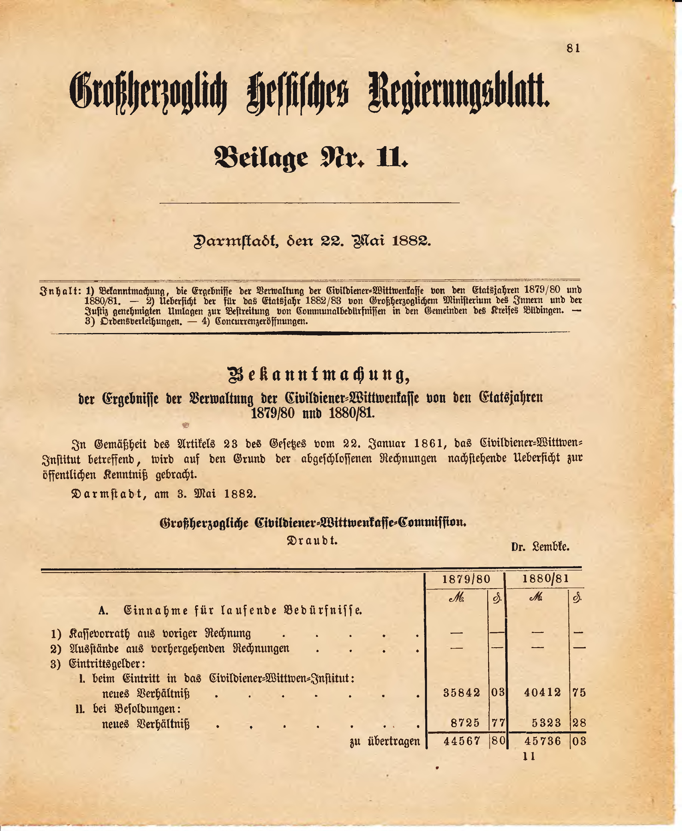 | Inhalt: | 1) Bekanntmachung, die Ergebnisse der Verwaltung der Civildiener-Wittwenkasse von den Etatsjahren 1879/80 und 1880/81. - 2) Uebersicht der für das Etatsjahr 1882/83 von Großherzoglichem Ministerium des Innern und der Justiz genehmigten Umlagen zur Bestreitung von Communalbedürfnissen in den Gemeinden des Kreises Büdingen. - 3) Ordensverleihungen. - 4) Concurrenzeröffnungen. |