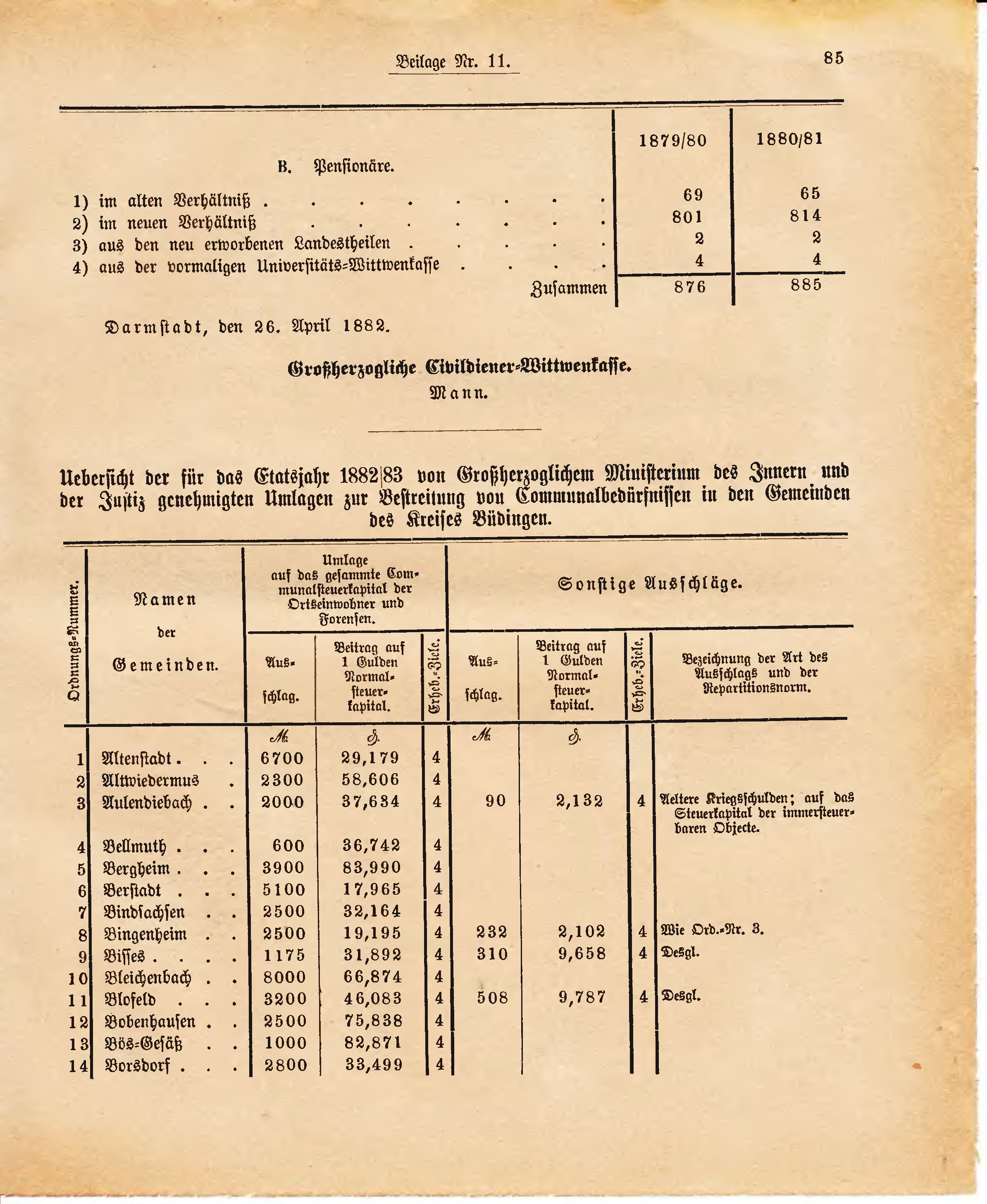 Uebersicht der für das Etatsjahr 1882/83 von Großherzoglichem Ministerium des Innern und der Justiz genehmigten Umlagen zur Bestreitung von Communalbedürfnissen in den Gemeinden des Kreises Büdingen.