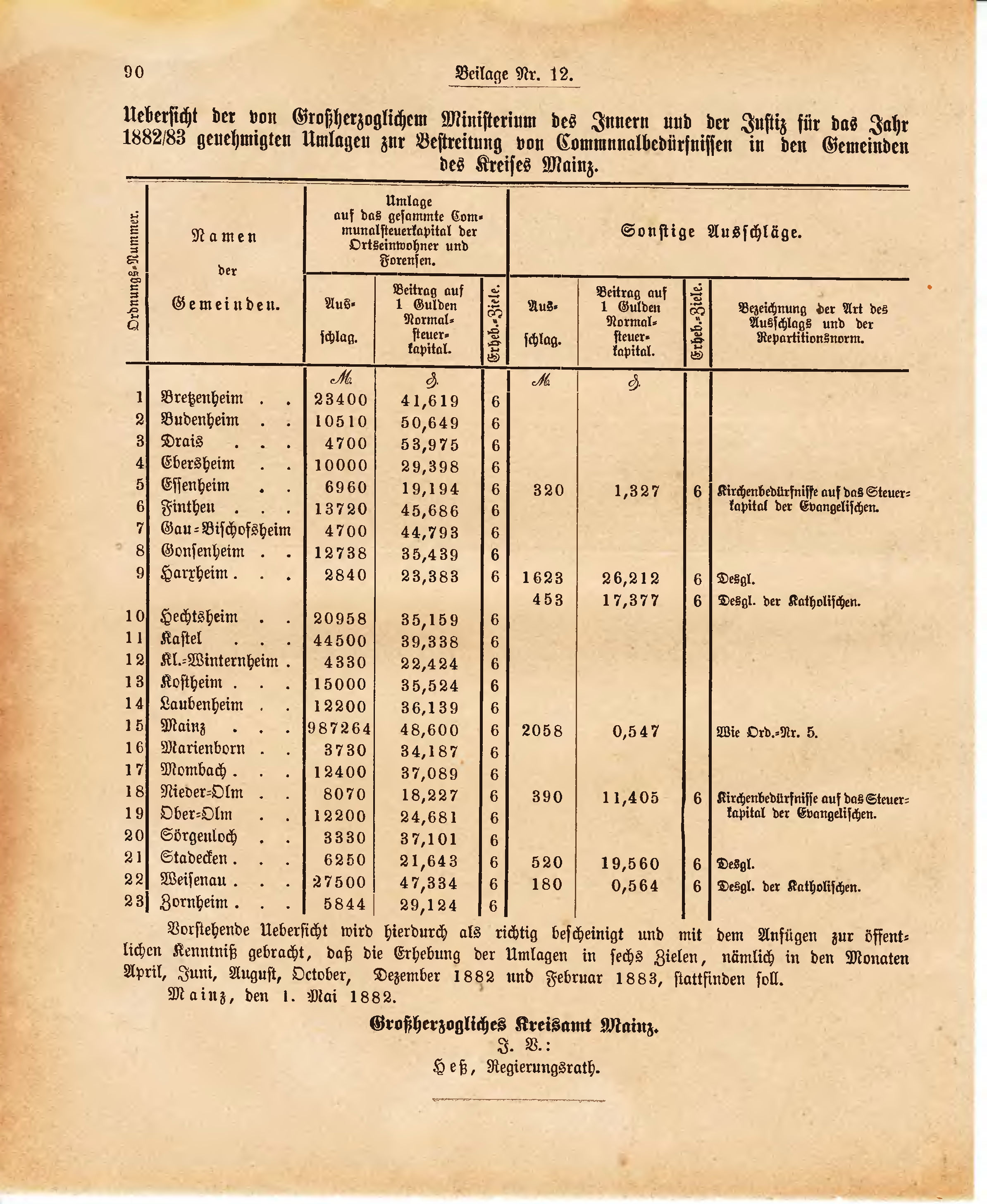 Uebersicht der von Großherzoglichem Ministerium des Innern und der Justiz für das Jahr 1882/83 genehmigten Umlagen zur Bestreitung von Communalbedürfnissen in den Gemeinden des Kreises Mainz.