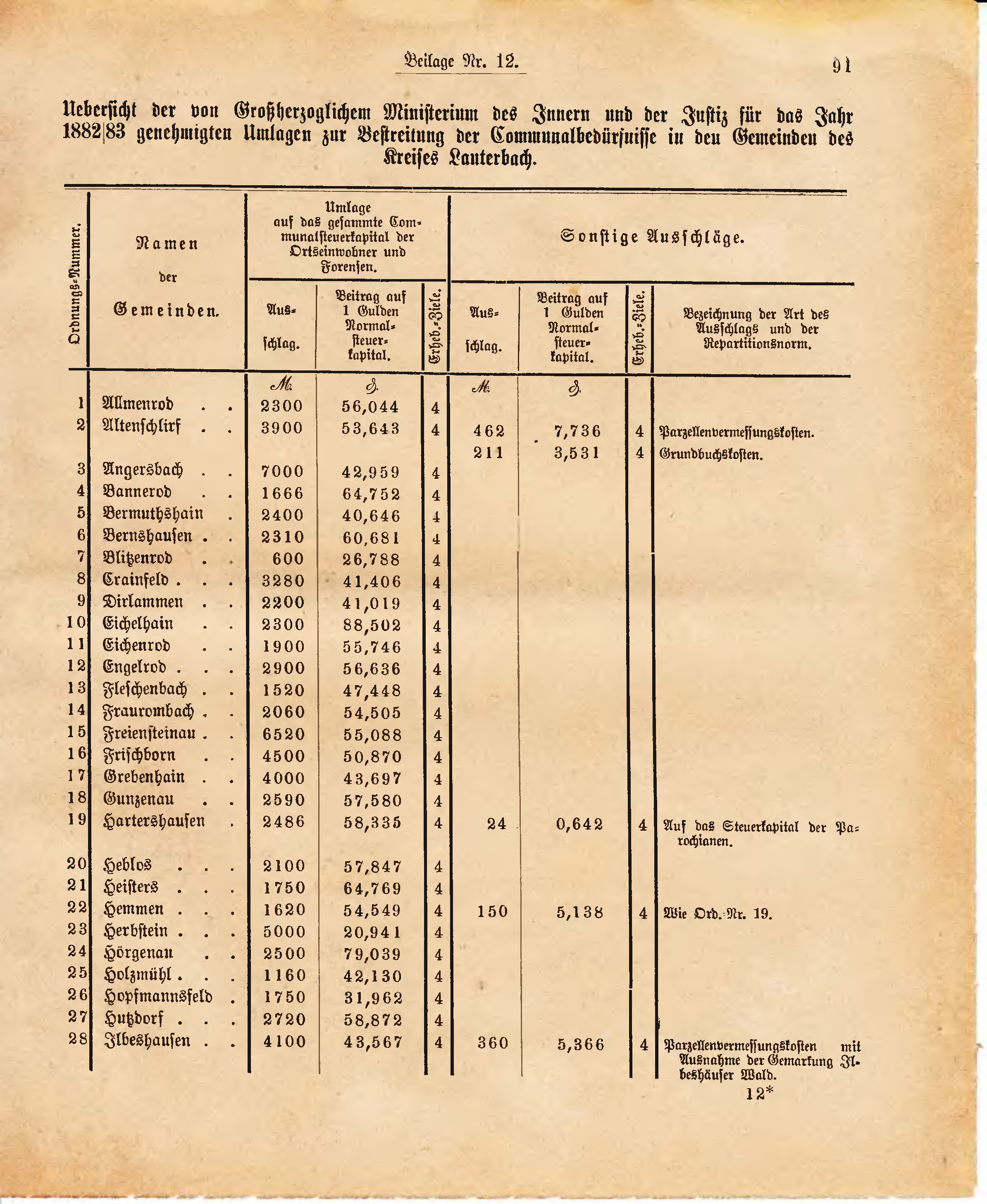 Uebersicht der von Großherzoglichem Ministerium des Innern und der Justiz für das Jahr 1882/83 genehmigten Umlagen zur Bestreitung von Communalbedürfnissen in den Gemeinden des Kreises Lauterbach.