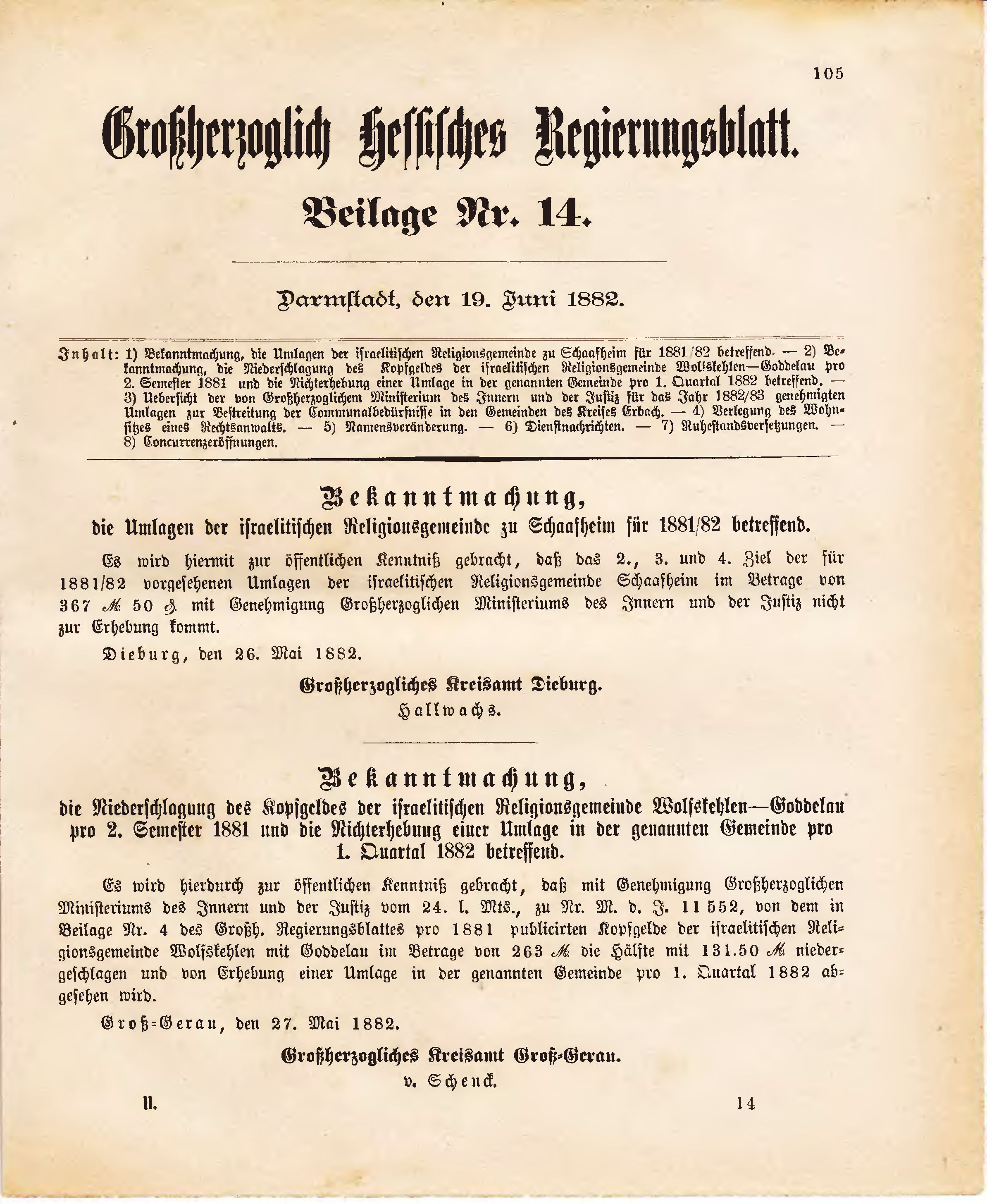 Es wird hierdurch zur öffentlichen Kenntniß gebracht, daß mit Genehmigung Großherzoglichen Ministeriums des Innern und der Justiz vom 24. l. Mts., zu Nr. M. d. J. 11 552, von dem in Beilage Nr. 4 des Großh. Regierungsblattes pro 1881 publicirten Kopfgelde der israelitischen Religionsgemeinde Wolfskehlen mit Goddelau im Betrage von 263