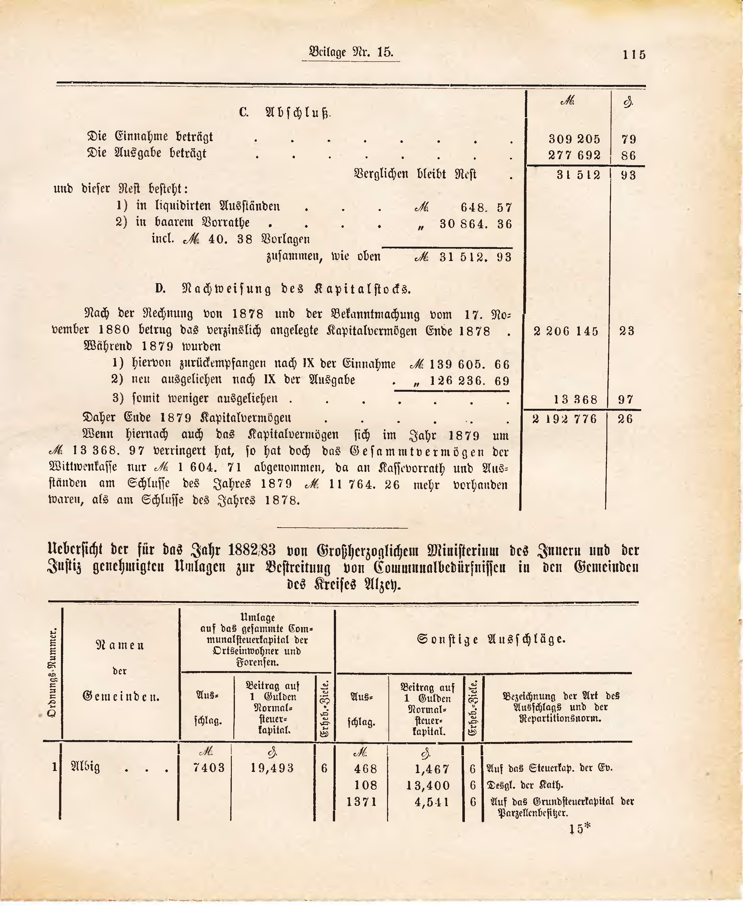 Uebersicht der für das Jahr 1882/83 von Großherzoglichem Ministerium des Innern und der Justiz genehmigten Umlagen zur Bestreitung von Communalbedürfnissen in den Gemeinden des Kreises Alzey.