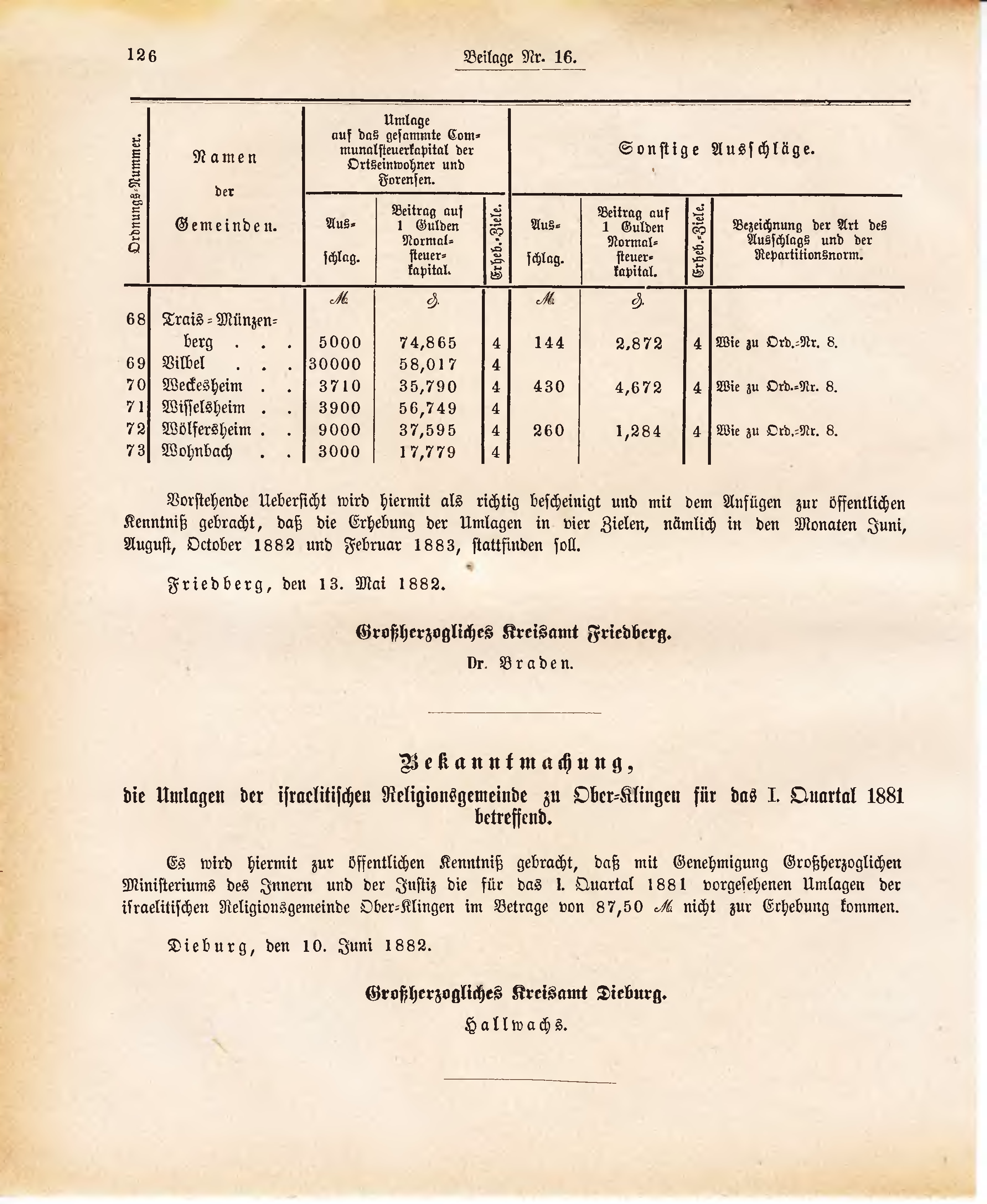 Es wird hiermit zur öffentlichen Kenntniß gebracht, daß mit Genehmigung Großherzoglichen Ministeriums des Innern und der Justiz die für das 1. Quartal 18811 vorgesehenen Umlagen der israelitischen Religionsgemeinde Ober-Klingen im Betrage von 87,50
