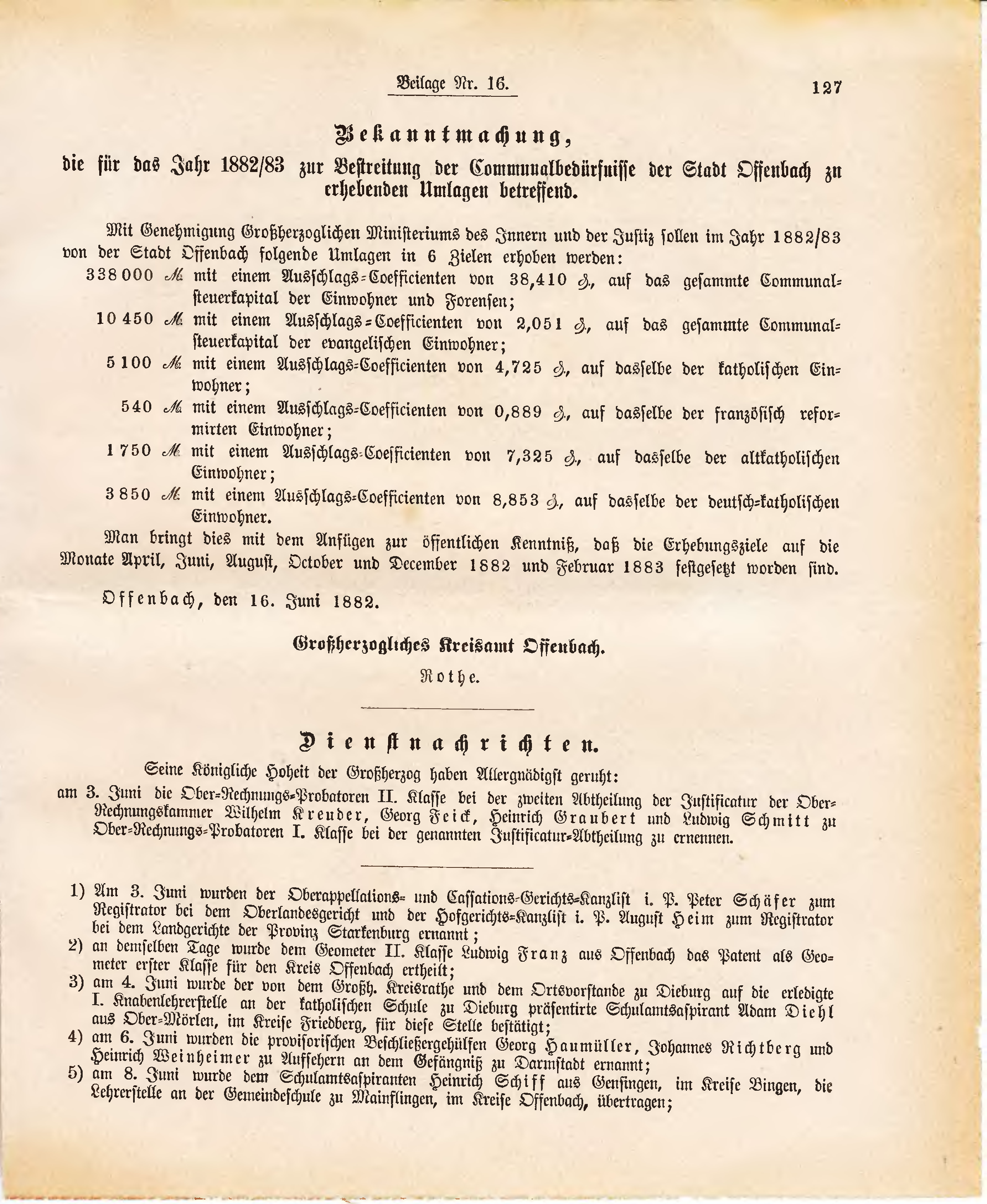 Mit Genehmigung Großherzoglichen Ministeriums des Innern und der Justiz sollen im Jahr 1882/83 von der Stadt Offenbach folgende Umlagen in 6 Zielen erhoben werden: