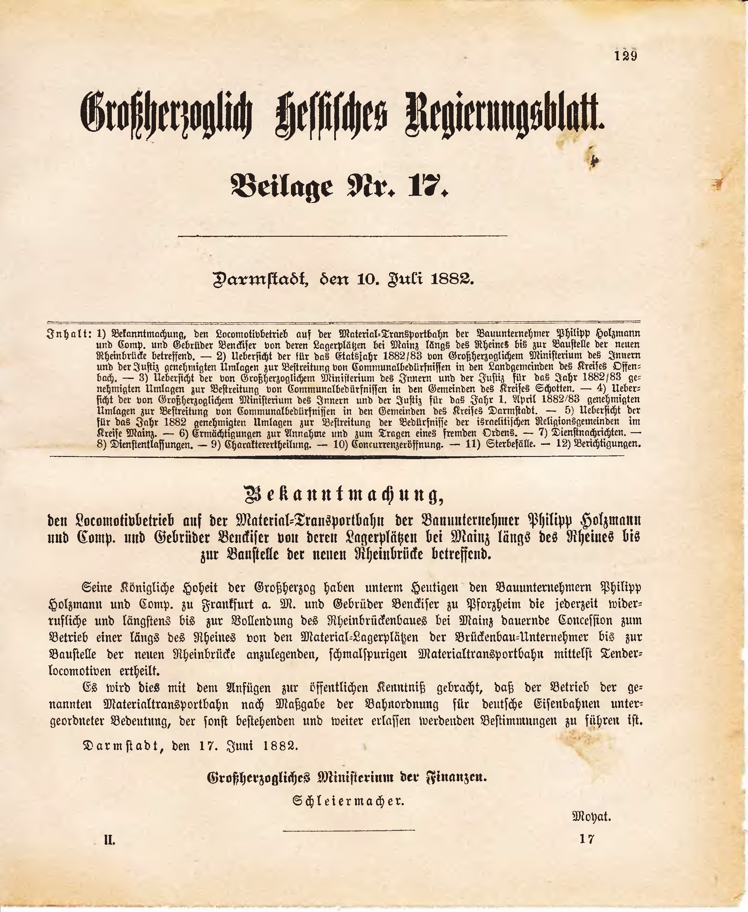 Seine Königliche Hoheit der Großherzog haben unterm Heutigen den Bauunternehmern Philipp Holzmann und Comp. zu Frankfurt a. M. und Gebrüder Benckiser zu Pforzheim die jederzeit widerrufliche und längstens bis zur Vollendung des Rheinbrückenbaues bei Mainz dauernde Concession zum Betrieb einer längs des Rheines von den Material-Lagerplätzen der Brückenbau-Unternehmer bis zur Baustelle der neuen Rheinbrücke anzulegenden, schmalspurigen Materialtransportbahn mittelst Tenderlocomotiven ertheilt.