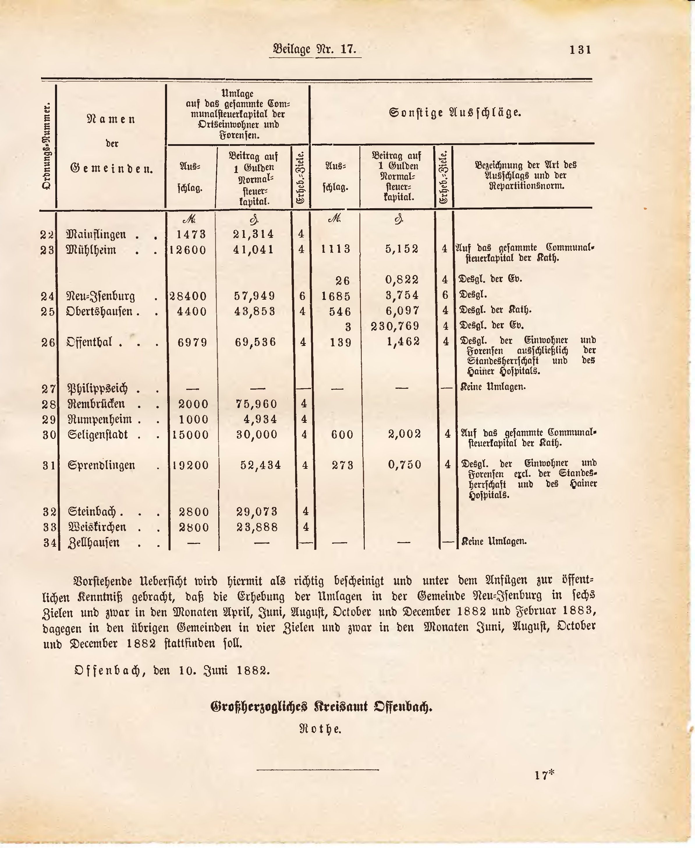 | Vorstehende Uebersicht wird hiermit als richtig bescheinigt und unter dem Anfügen zur öffentlichen Kenntniß gebracht, daß die Erhebung der Umlagen in der Gemeinde Neu-Isenburg in sechs Zielen und zwar in den Monaten April, Juni, August, October und December 1882 und Februar 1883, dagegen in den übrigen Gemeinden in vier Zielen und zwar in den Monaten Juni, August, October und December 1882 stattfinden soll. | |