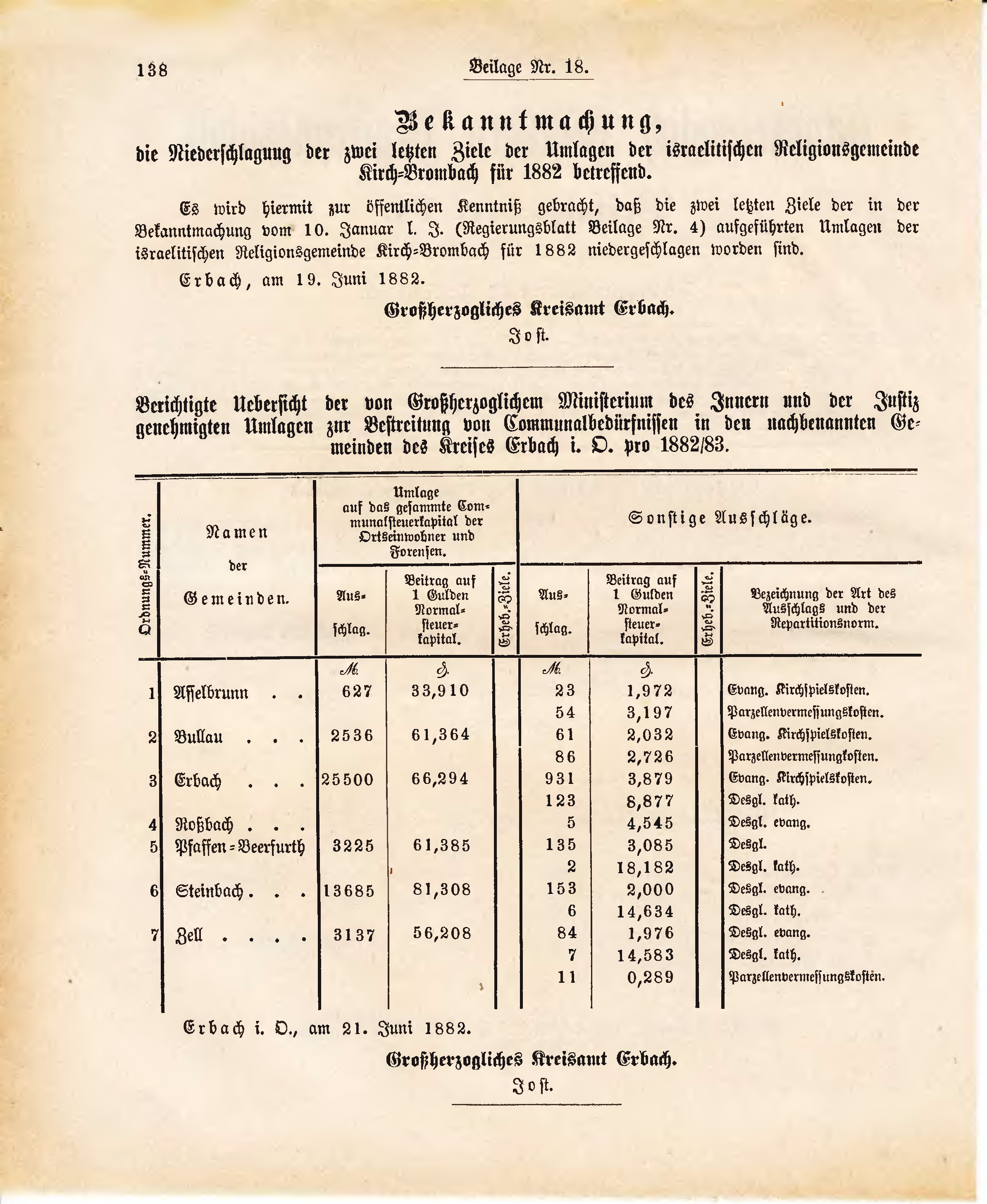 Es wird hiermit zur öffentlichen Kenntniß gebracht, daß die zwei letzten Ziele der in der Bekanntmachung vom 10. Januar l. J. (Regierungsblatt Beilage Nr. 4) aufgeführten Umlagen der israelitischen Religionsgemeinde Kirch-Brombach für 1882 niedergeschlagen worden sind.