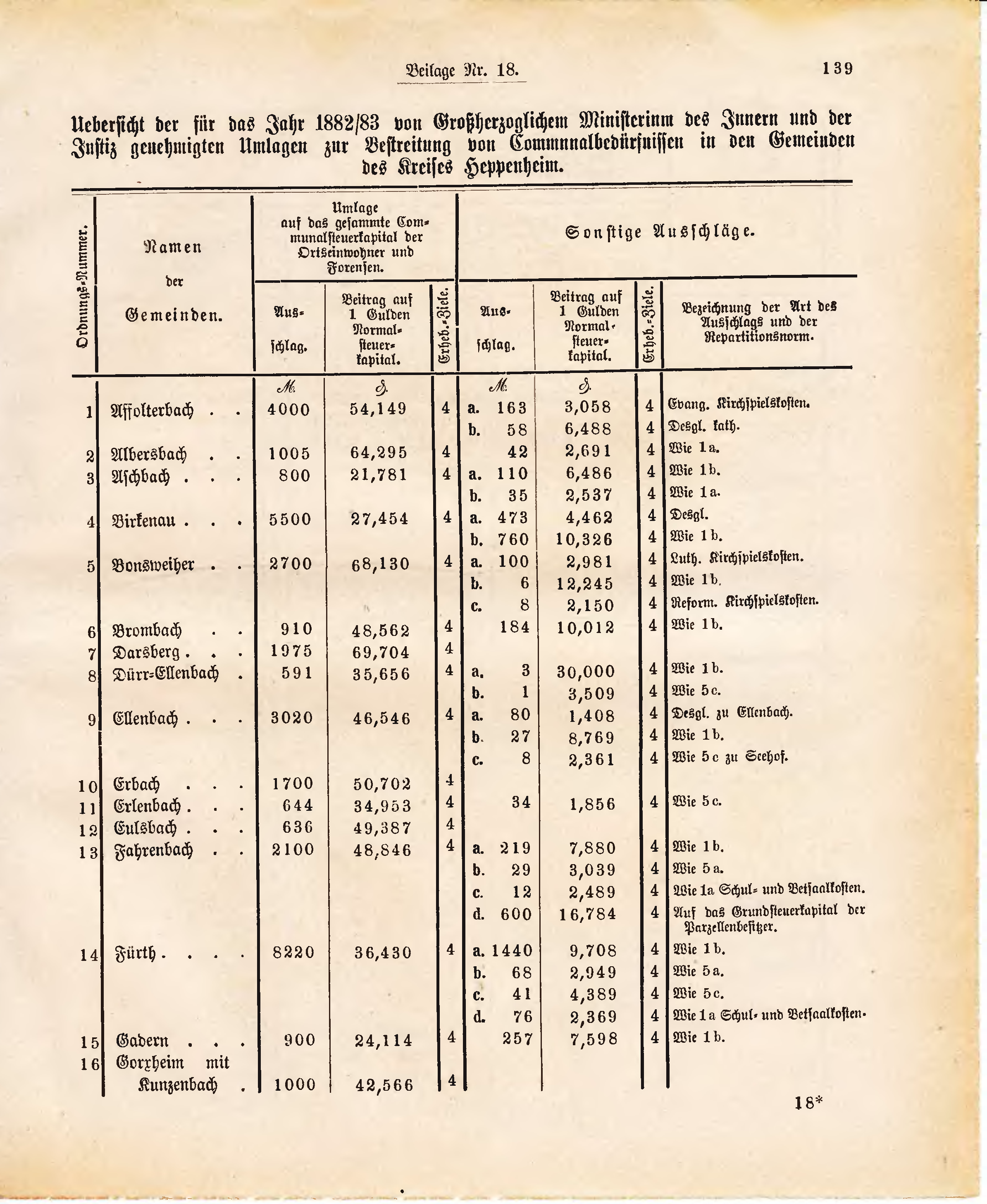 Uebersicht der für das Jahr 1882/83 von Großherzoglichem Ministerium des Innern und der Justiz genehmigten Umlagen zur Bestreitung von Communalbedürfnissen in den Gemeinden des Kreises Heppenheim.