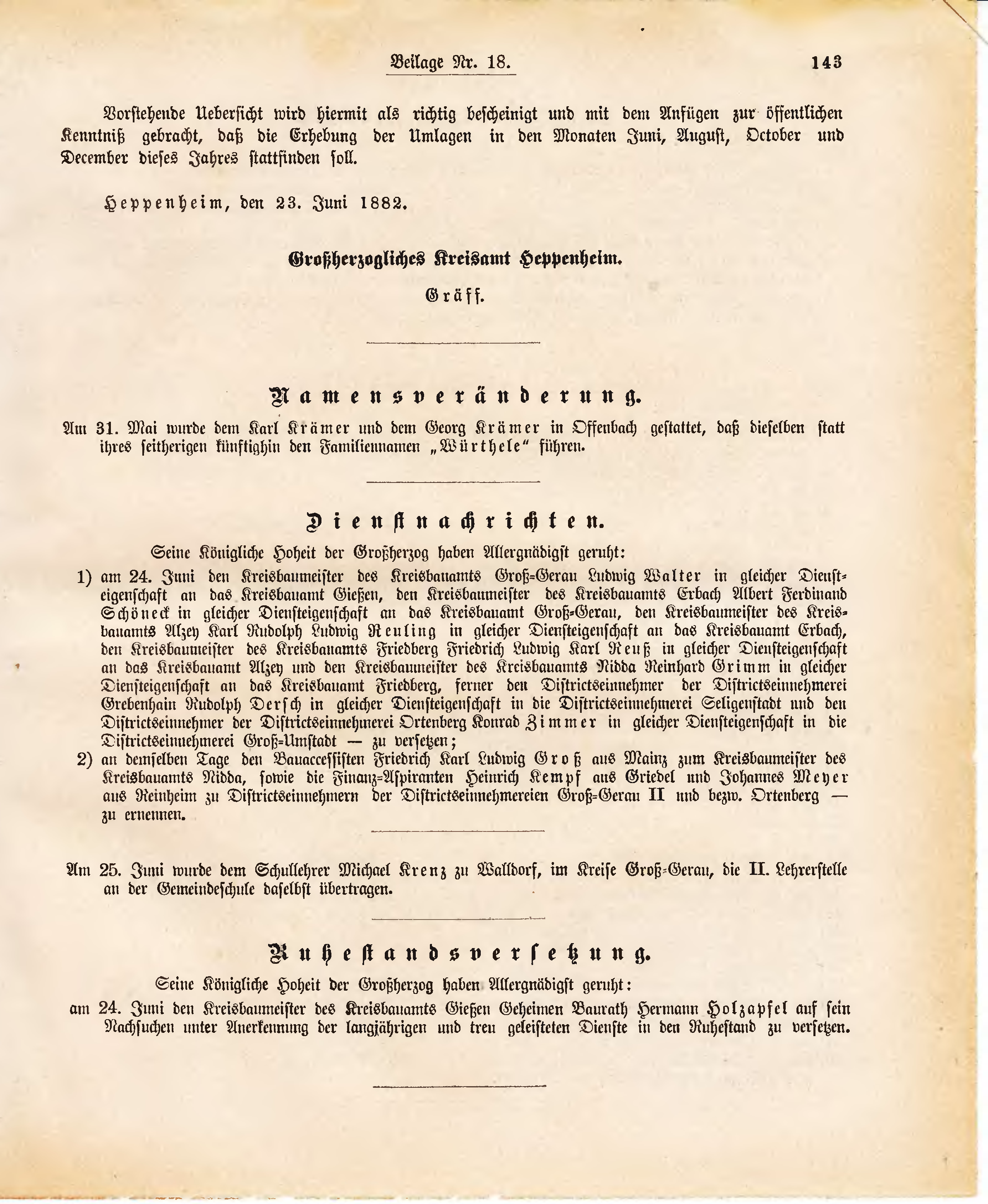 | Am | 31. Mai wurde dem Karl Krämer und dem Georg Krämer in Offenbach gestattet, daß dieselben statt ihres seitherigen künftighin den Familiennamen "Würthele" führen. |