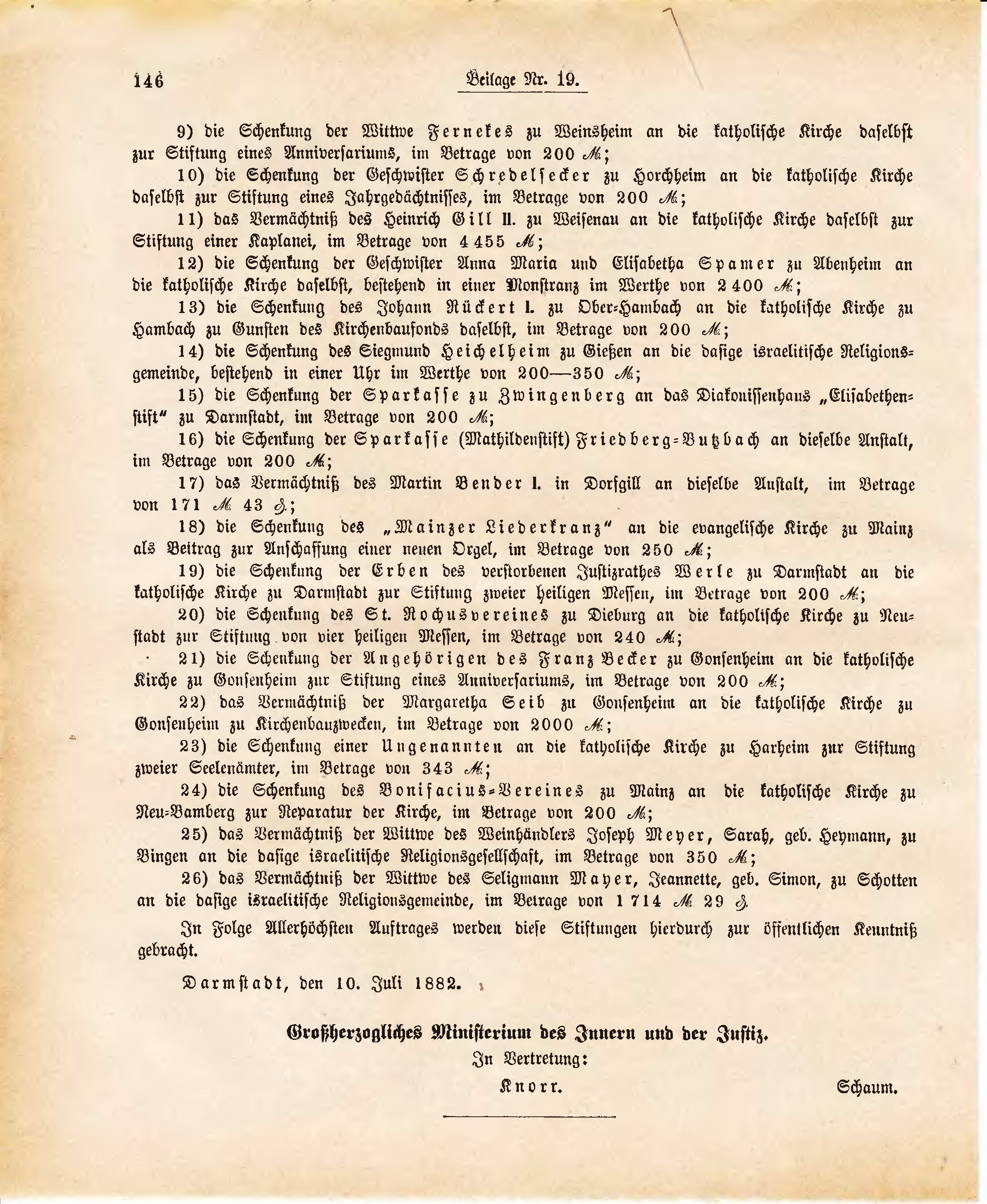 19) die Schenkung der Erben des verstorbenen Justizrathes Werle zu Darmstadt an die katholische Kirche zu Darmstadt zur Stiftung zweier heiligen Messen, im Betrage von 200