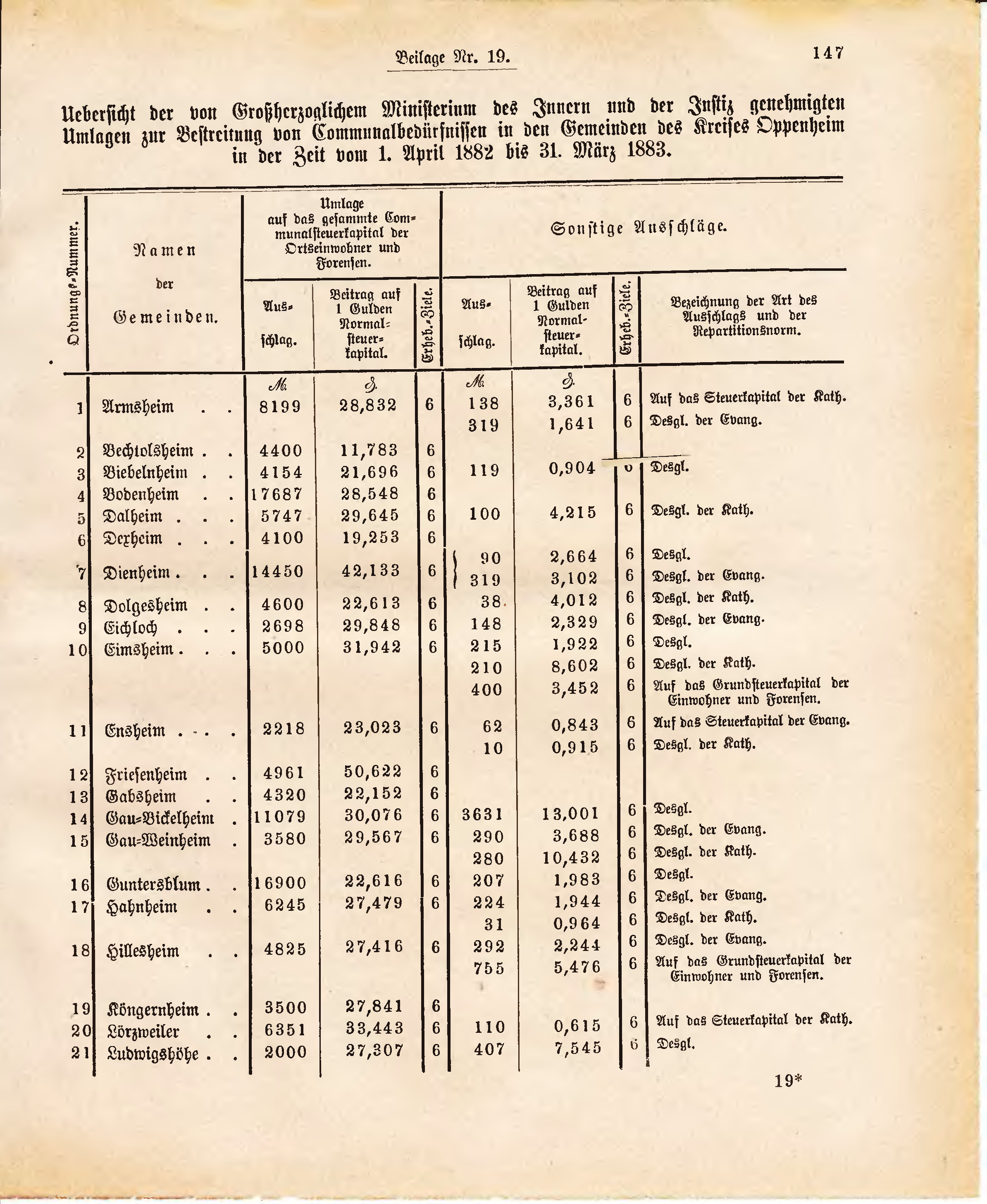 Uebersicht der von Großherzoglichem Ministerium des Innern und der Justiz genehmigten Umlagen zur Bestreitung von Communalbedürfnissen in den Gemeinden des Kreises Oppenheim in der Zeit vom 1. April 1882 bis 31. März 1883.