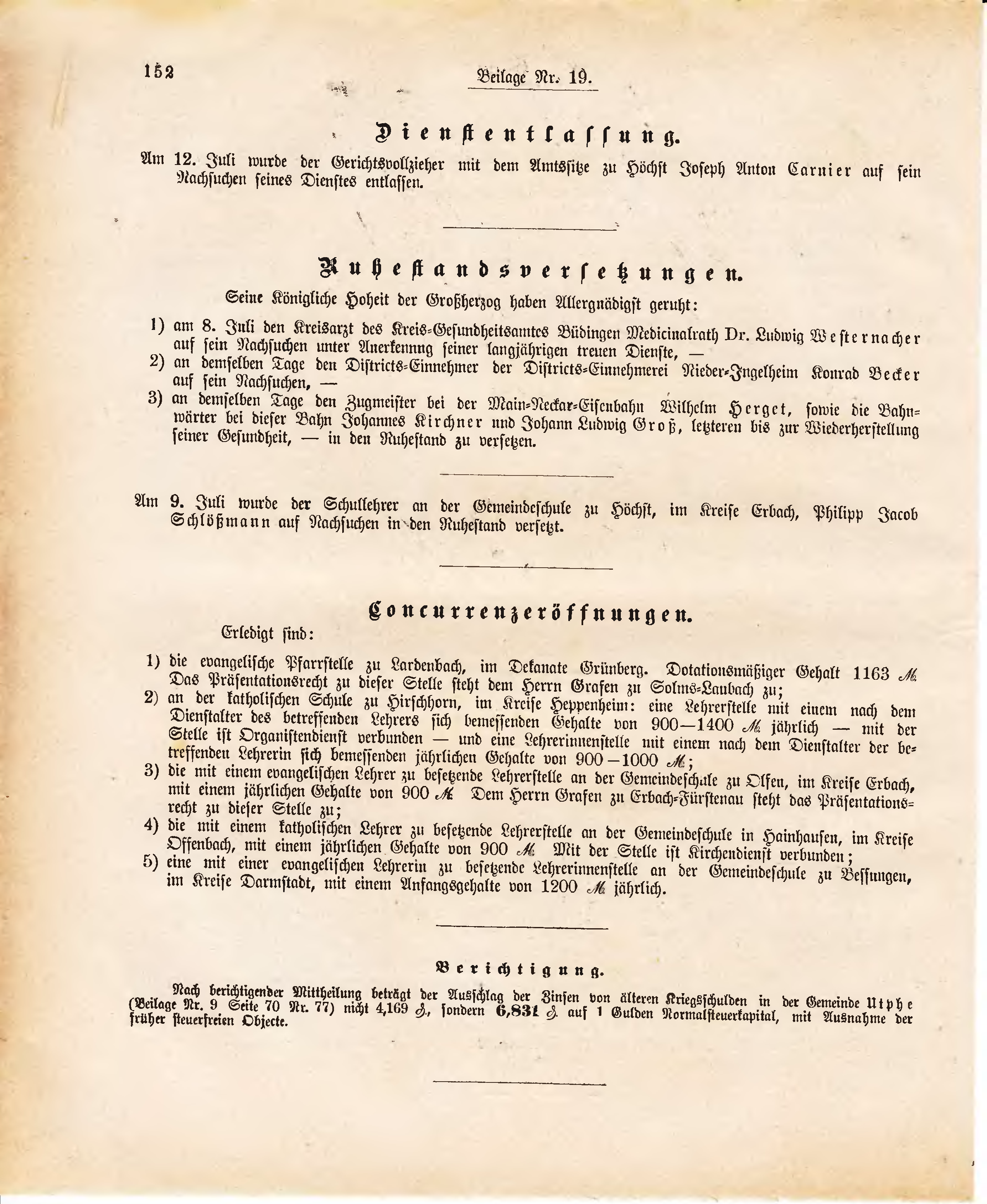 | Am | 12. Juli wurde der Gerichtsvollzieher mit dem Amtssitze zu Höchst Joseph Anton Carnier auf sein Nachsuchen seines Dienstes entlassen. |