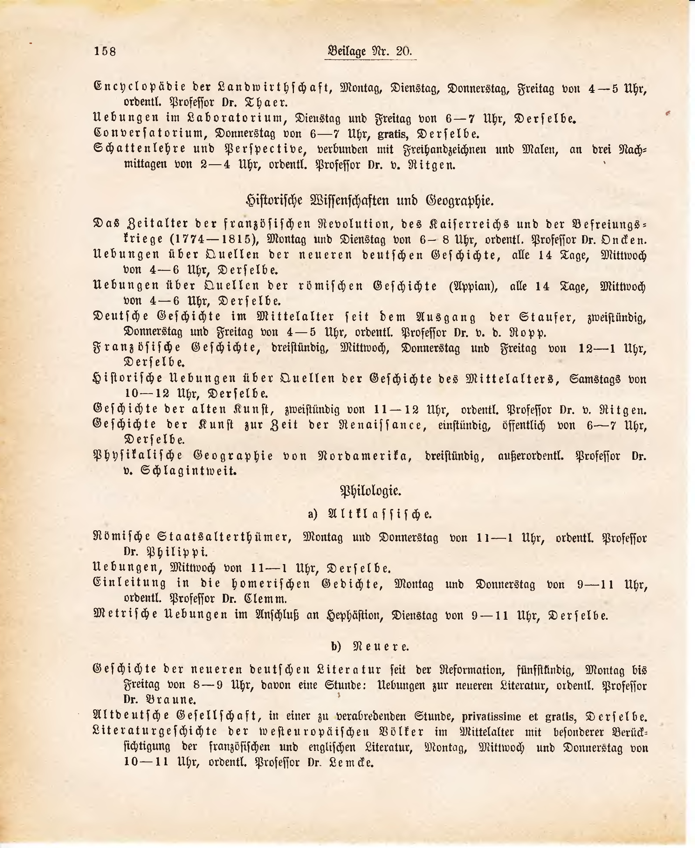 Encyclopädie der Landwirthschaft, Montag, Dienstag, Donnerstag, Freitag von 4-5 Uhr, ordentl. Professor Dr. Thaer.