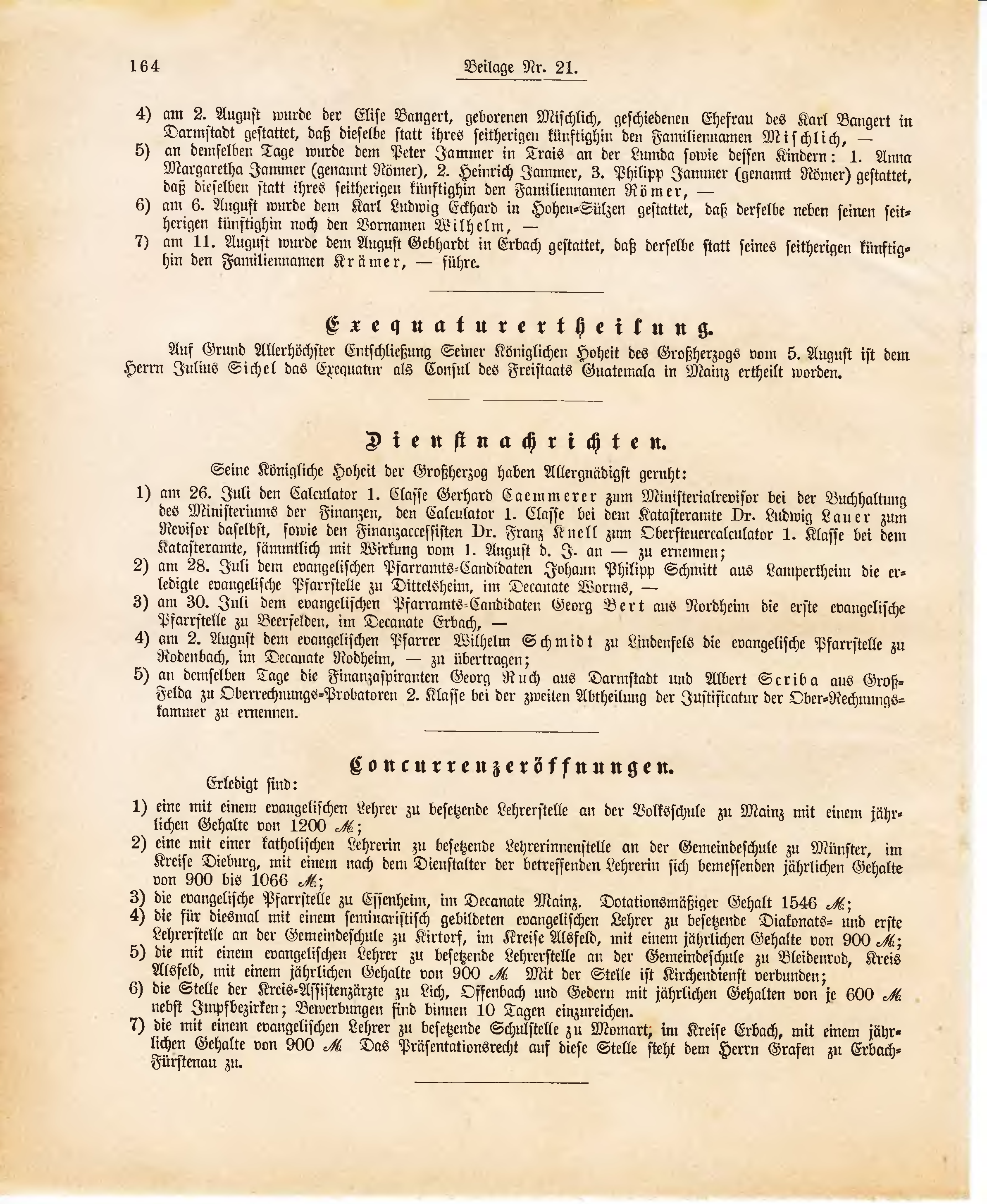 Auf Grund Allerhöchster Entschließung Seiner Königlichen Hoheit des Großherzogs vom 5. August ist dem Herrn Julius Sichel das Exequatur als Consul des Freistaats Guatemala in Mainz ertheilt worden.