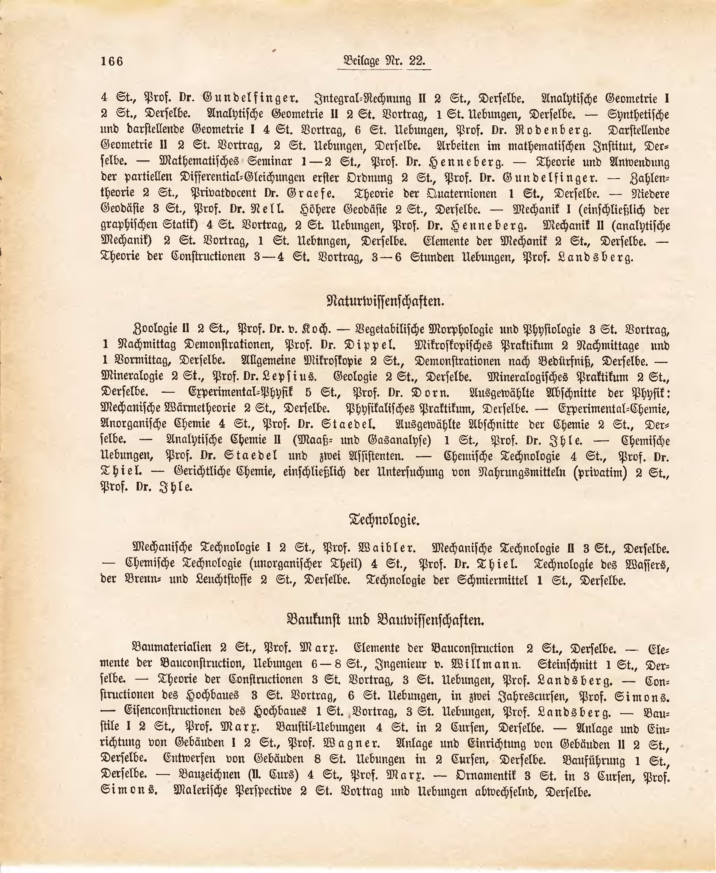 4 St., Prof. Dr. Gundelfinger. Integral-Rechnung II 2 St., Derselbe. Analytische Geometrie I 2 St., Derselbe. Analytische Geometrie II 2 St. Vortrag, 1 St. Uebungen, Derselbe. – Synthetische und darstellende Geometrie I 4 St. Vortrag, 6 St. Uebungen, Prof. Dr. Rodenberg. Darstellende Geometrie II 2 St. Vortrag, 2 St. Uebungen, Derselbe. Arbeiten im mathematischen Institut, Derselbe. - Mathematisches-Seminar 1-2 St., Prof. Dr. Henneberg. - Theorie und Anwendung der partiellen Differential-Gleichungen erster Ordnung 2 St., Prof. Dr. Gundelfinger. - Zahlentheorie 2 St., Privatdocent Dr. Graefe. Theorie der Quaternionen 1 St., Derselbe. - Niedere Geodäsie 3 St., Prof. Dr. Nell. Höhere Geodäsie 2 St., Derselbe. - Mechanik I (einschließlich der graphischen Statik) 4 St. Vortrag, 2 St. Uebungen, Prof. Dr. Henneberg. Mechanik II (analytische