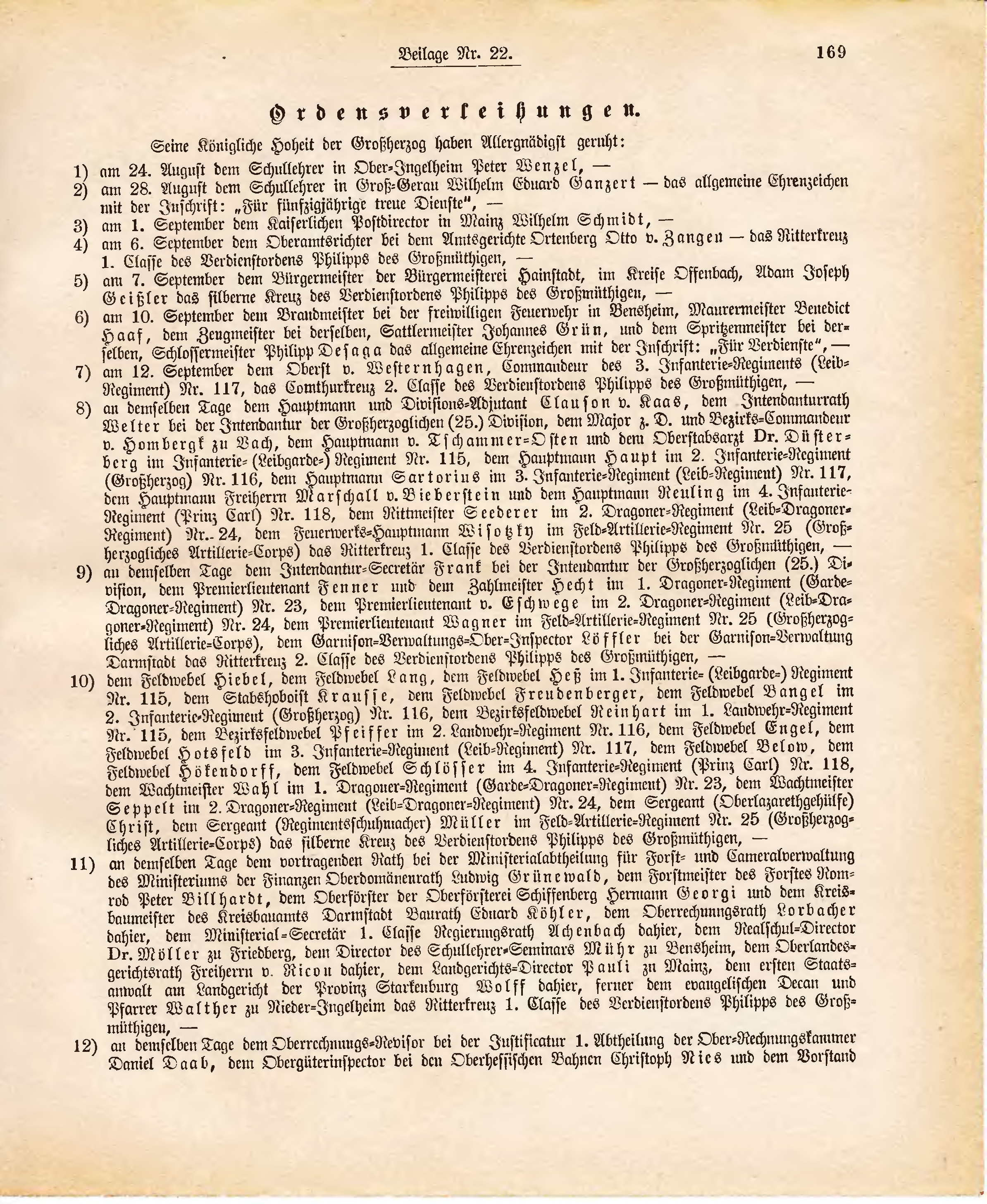 | 10) | dem Feldwebel Hiebel, dem Feldwebel Lang, dem Feldwebel Heß im 1. Infanterie- (Leibgarde-) Regiment Nr. 115, dem Stabshoboist Krausse, dem Feldwebel Freudenberger, dem Feldwebel Bangel im 2. Infanterie-Regiment (Großherzog) Nr. 116, dem Bezirksfeldwebel Reinhart im 1. Landwehr-Regiment Nr. 115, dem Bezirksfeldwebel Pfeiffer im 2. Landwehr-Regiment Nr. 116, dem Feldwebel Engel, dem Feldwebel Hotsfeld im 3. Infanterie-Regiment (Leib-Regiment) Nr. 117, dem Feldwebel Below, dem Feldwebel Hökendorff, dem Feldwebel Schlösser im 4. Infanterie-Regiment (Prinz Carl) Nr. 118, dem Wachtmeister Wahl im 1. Dragoner-Regiment (Garde-Dragoner-Regiment) Nr. 23, dem Wachtmeister Seppelt im 2. Dragoner-Regiment (Leib-Dragoner-Regiment) Nr. 24, dem Sergeant (Oberlazarethgehülfe) Christ, dem Sergeant (Regimentsschuhmacher) Müller im Feld-Artillerie-Regiment Nr. 25 (Großherzogliches Artillerie-Corps) das silberne Kreuz des Verdienstordens Philipps des Großmüthigen, - |