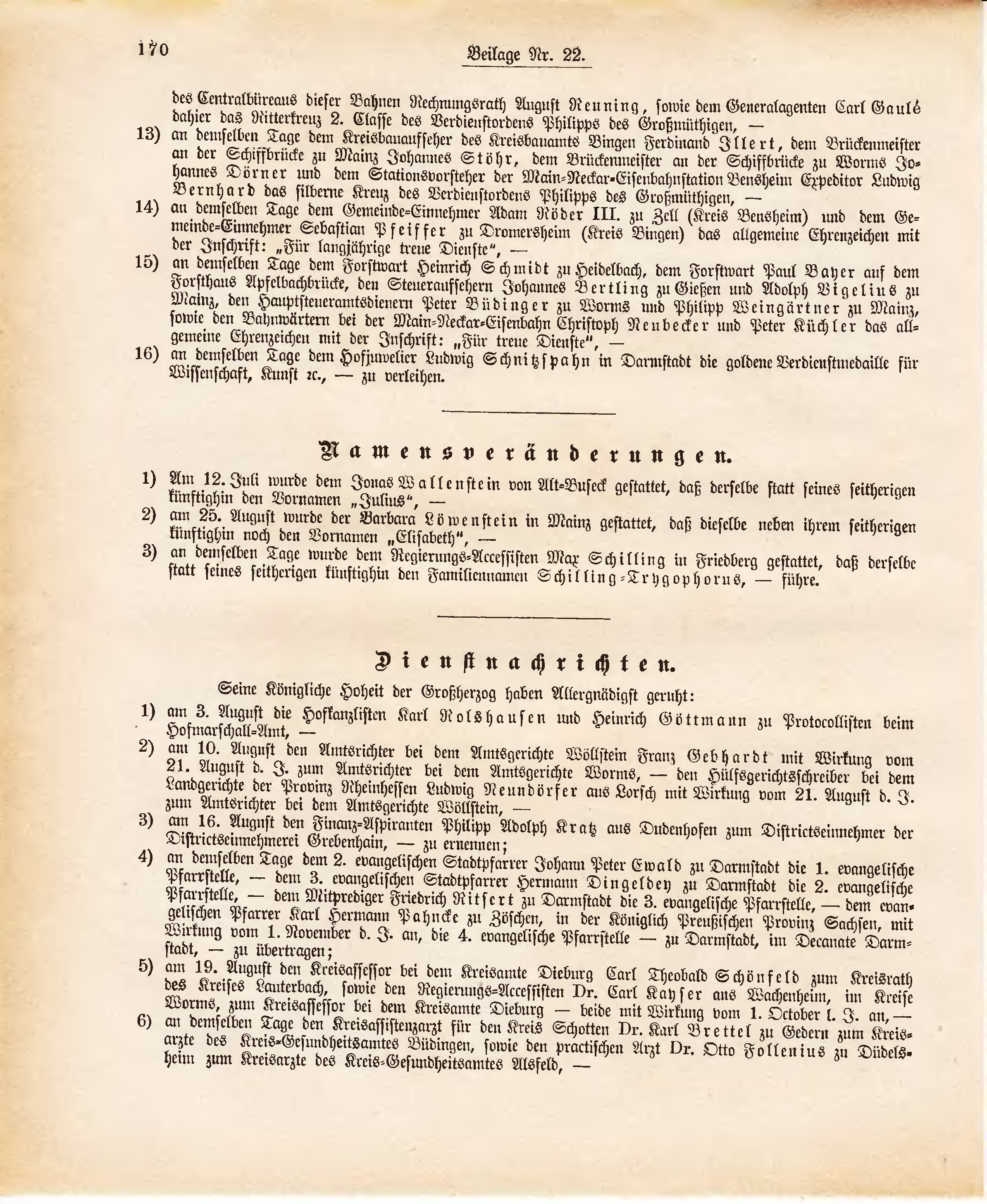 | 15) | an demselben Tage dem Forstwart Heinrich Schmidt zu Heidelbach, dem Forstwart Paul Bayer aus dem Forsthaus Apfelbachbrücke, den Steueraufsehern Johannes Bertling zu Gießen und Adolph Vigelius zu Mainz, den Hauptsteueramtsdienern Peter Büdinger zu Worms und Philipp Weingärtner zu Mainz, sowie den Bahnwärtern bei der Main-Neckar-Eisenbahn Christoph Neubecker und Peter Küchler das allgemeine Ehrenzeichen mit der Inschrift: "Für treue Dienste", - |