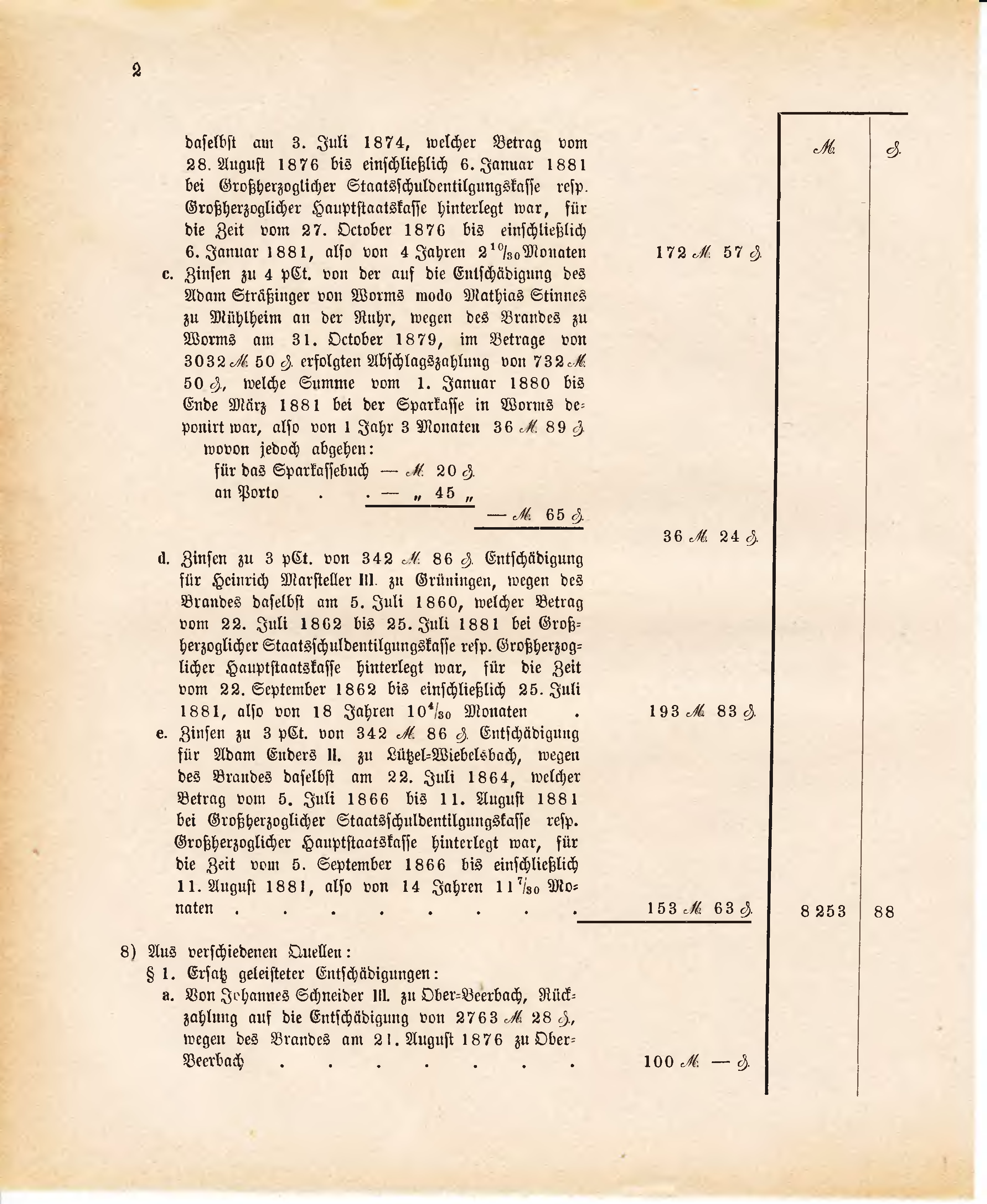 Zinsen zu 4 pCt. von der auf die Entschädigung des Adam Sträßinger von Worms modo Mathias Stinnes zu Mühlheim an der Ruhr, wegen des Brandes zu Worms am 31. October 1879, im Betrage von 3032 50 erfolgten Abschlagszahlung von 732 50 , welche Summe vom 1. Januar 1880 bis Ende März 1881 bei der Sparkasse in Worms deponirt war, also von 1 Jahr 3 Monaten 36 89  |