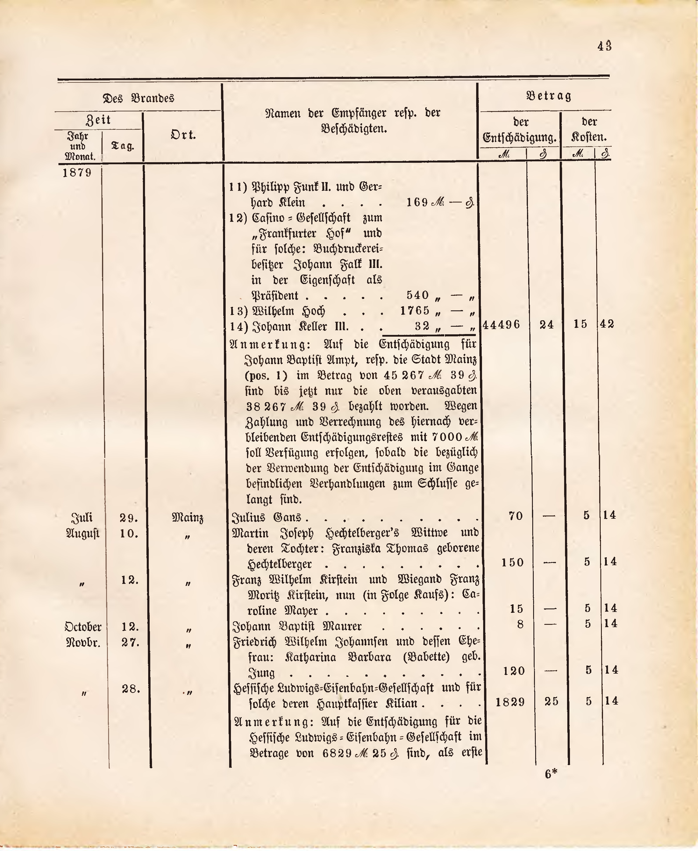 Anmerkung: Auf die Entschädigung für Johann Baptist Ampt, resp. die Stadt Mainz (pos. 1) im Betrag von 45 267 39 sind bis jetzt nur die oben verausgabten 38 267 39 bezahlt worden. Wegen Zahlung und Verrechnung des hiernach verbleibenden Entschädigungsrestes mit 7 000 soll Verfügung erfolgen, sobald die bezüglich der Verwendung der Entschädigung im Gange befindlichen Verhandlungen zum Schlusse gelangt sind.
