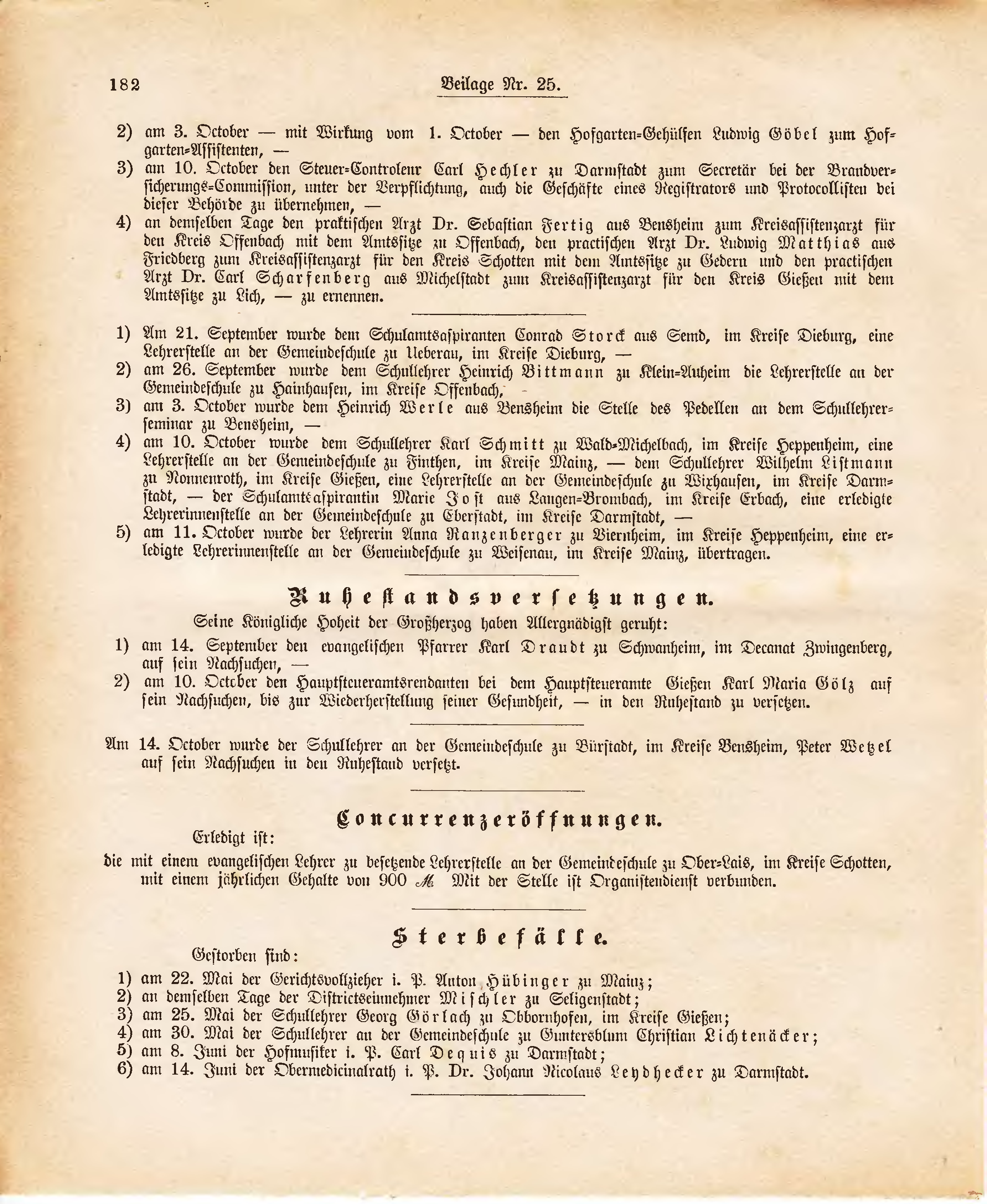 14. October wurde der Schullehrer an der Gemeindeschule zu Bürstadt, im Kreise Bensheim, Peter Wetzel auf sein Nachsuchen in den Ruhestand versetzt.