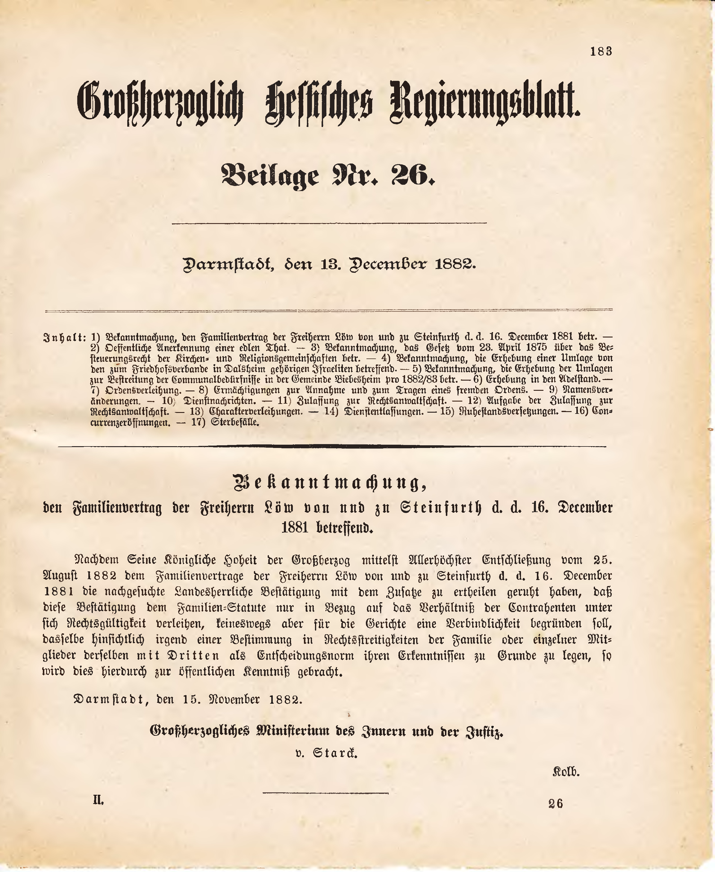 Nachdem Seine Königliche Hoheit der Großherzog mittelst Allerhöchster Entschließung vom 25. August 1882 dem Familienvertrage der Freiherrn Löw von und zu Steinfurth d. d. 16. December 1881 die nachgesuchte Landesherrliche Bestätigung mit dem Zusatze zu ertheilen geruht haben, daß diese Bestätigung dem Familien-Statute nur in Bezug auf das Verhältniß der Contrahenten unter sich Rechtsgültigkeit verleihen, keineswegs aber für die Gerichte eine Verbindlichkeit begründen soll, dasselbe hinsichtlich irgend einer Bestimmung in Rechtsstreitigkeiten der Familie oder einzelner Mitglieder derselben mit Dritten als Entscheidungsnorm ihren Erkenntnissen zu Grunde zu legen, so wird dies hierdurch zur öffentlichen Kenntniß gebracht.