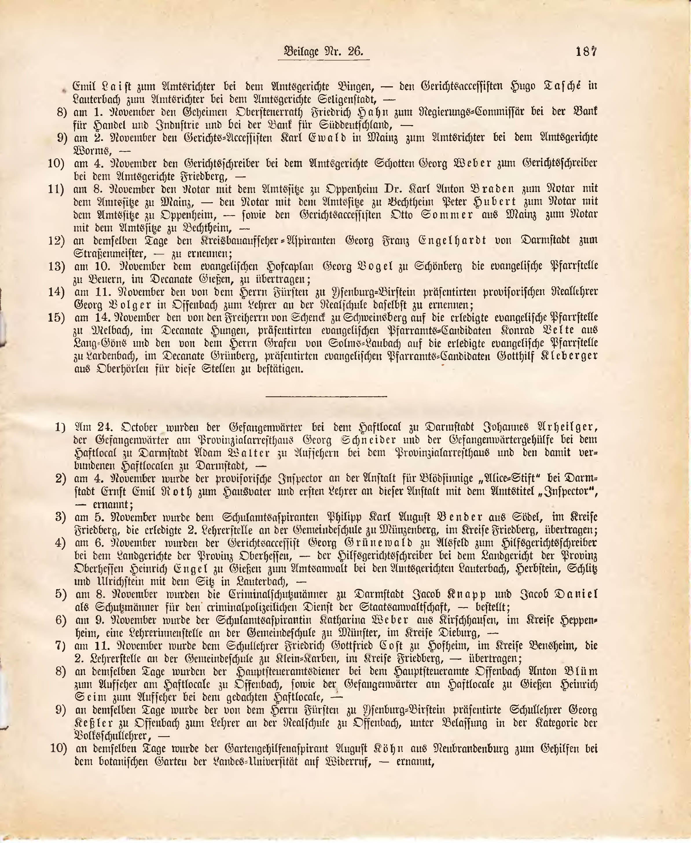 | 4) | am 6. Nove1nber wurden der Gerichtsaccessist Georg Grünewald zu Alsfeld zum Hilfsgerichtsschreiber bei dem Landgerichte der Provinz Oberhessen, - der Hilfsgerichtsschreiber bei dem Landgericht der Provinz Oberhessen Heinrich Engel zu Gießen zum Amtsanwalt bei den Amtsgerichten Lauterbach, Herbstein, Schlitz und Ulrichstein mit dem Sitz in Lauterbach, - |