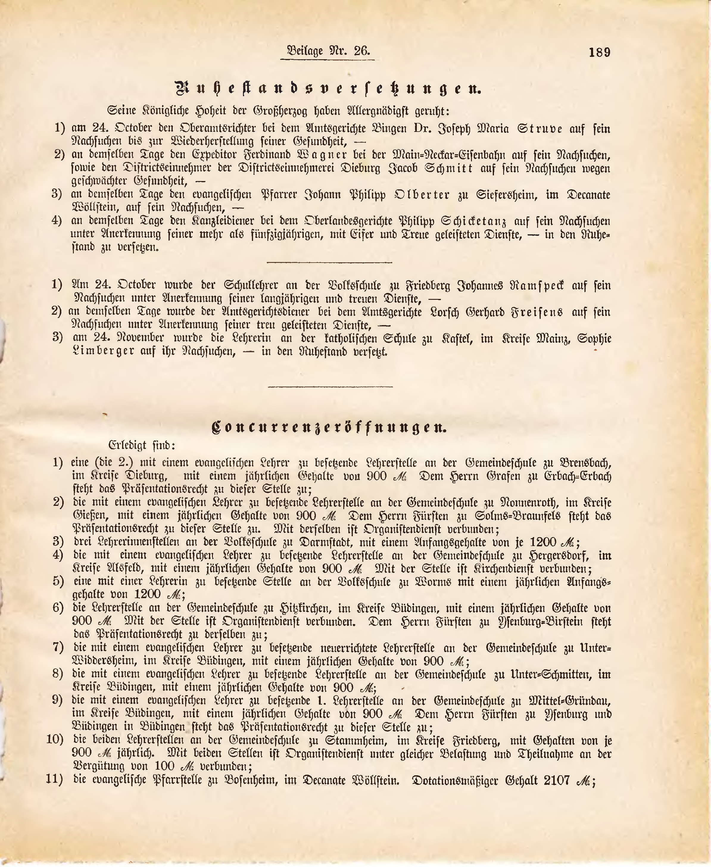 die mit einem evangelischen Lehrer zu besetzende 1. Lehrerstelle an der Gemeindeschule zu Mittel-Gründau, im Kreise Büdingen, mit einem jährlichen Gehalte von 900 Dem Herrn Fürsten zu Ysenburg und Büdingen in Büdingen steht das Präsentationsrecht zu dieser Stelle zu;