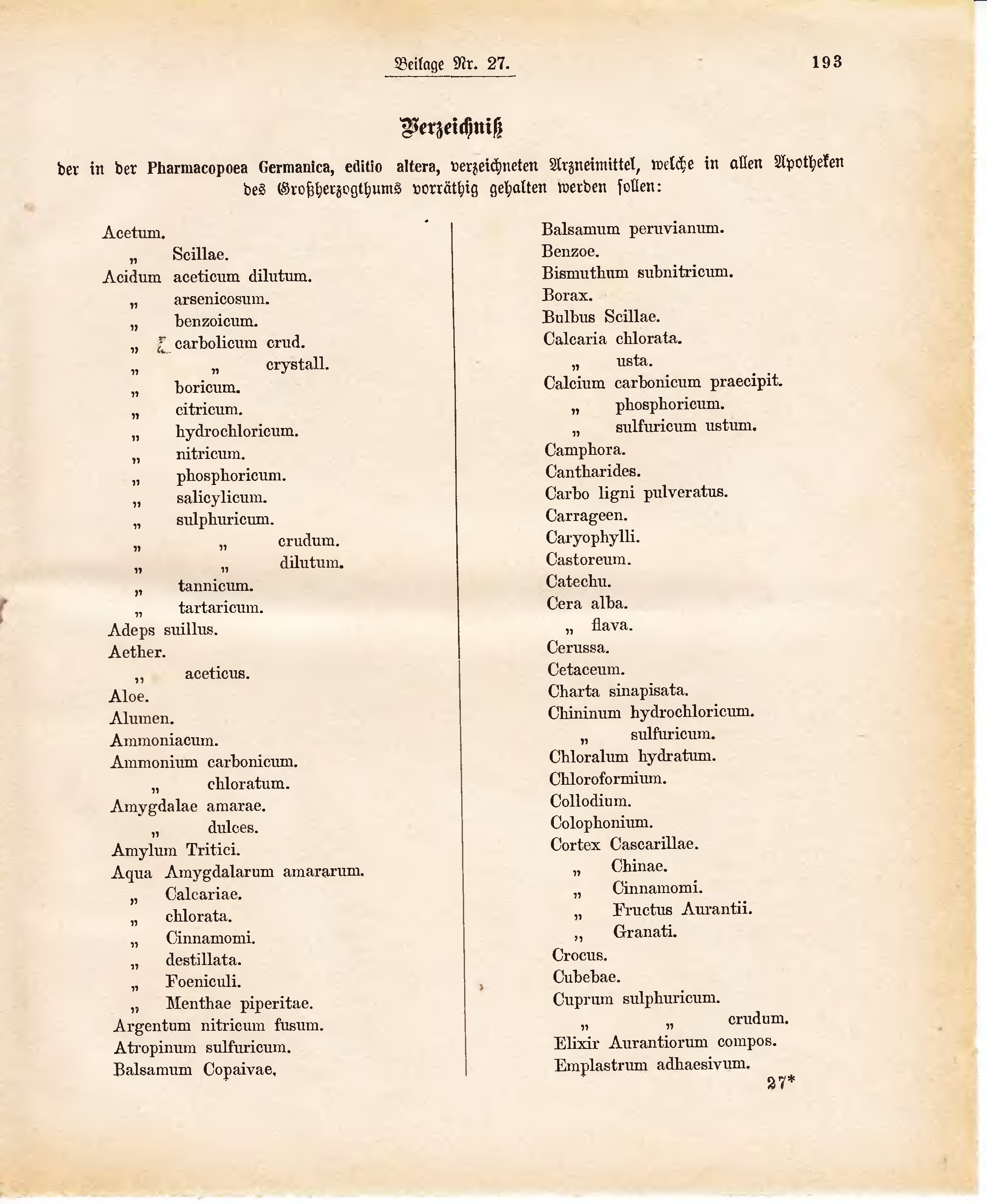 der in der Pharmacopoea Germanica, editio altera, verzeichneten Arzneimittel, welche in allen Apotheken des Großhezogthums vorräthig gehalten werden sollen: