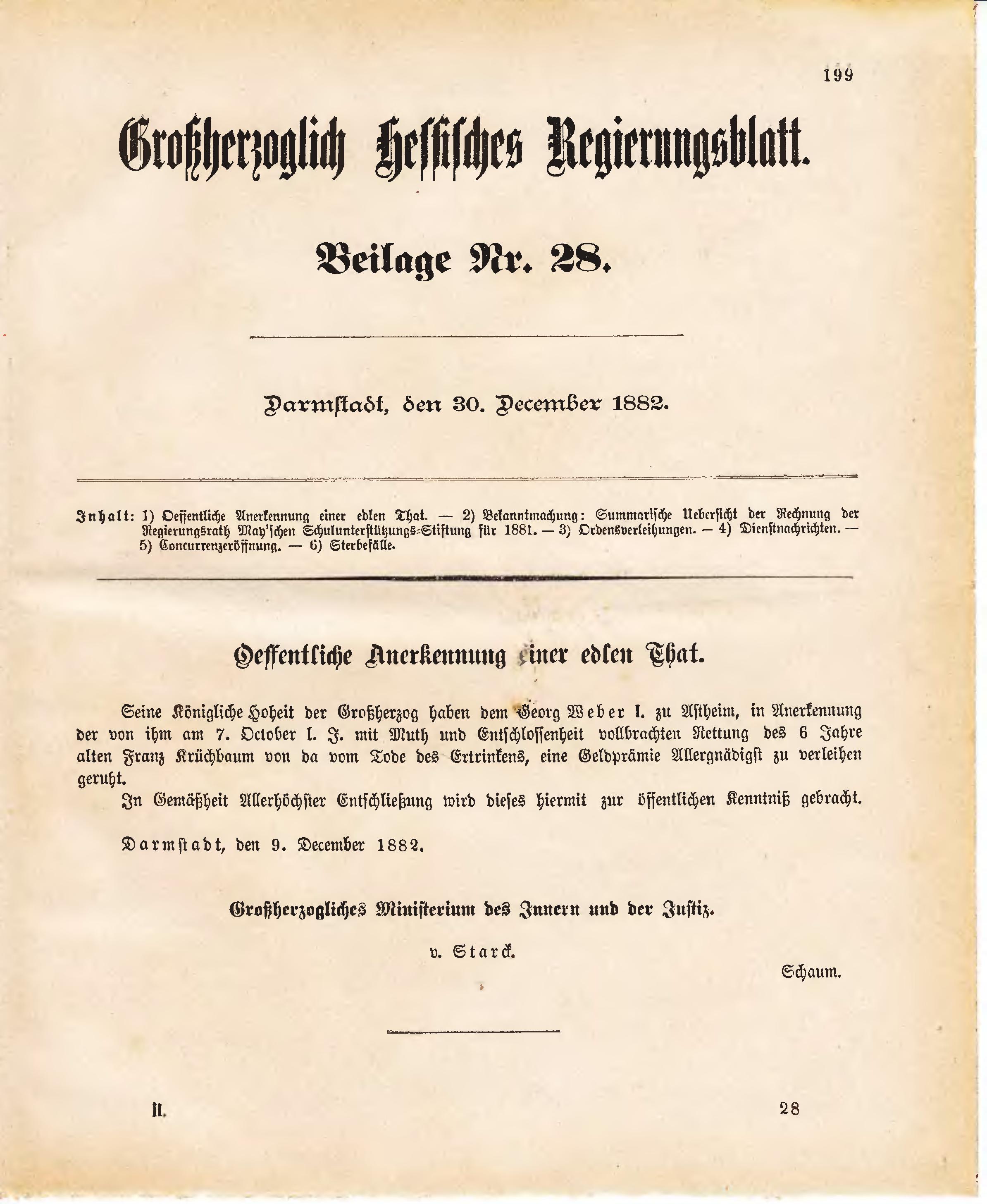 | Inhalt: | 1) Oeffentliche Anerkennung einer edlen That. - 2) Bekanntmachung: Summarische Uebersicht der Rechnung der Regierungsrath May`schen Schulunterstützungs-Stiftung für 1881. - 3) Ordensverleihungen. - 4) Dienstnachrichten. - 5) Concurrenzeröffnung. - 6) Sterbefälle. |