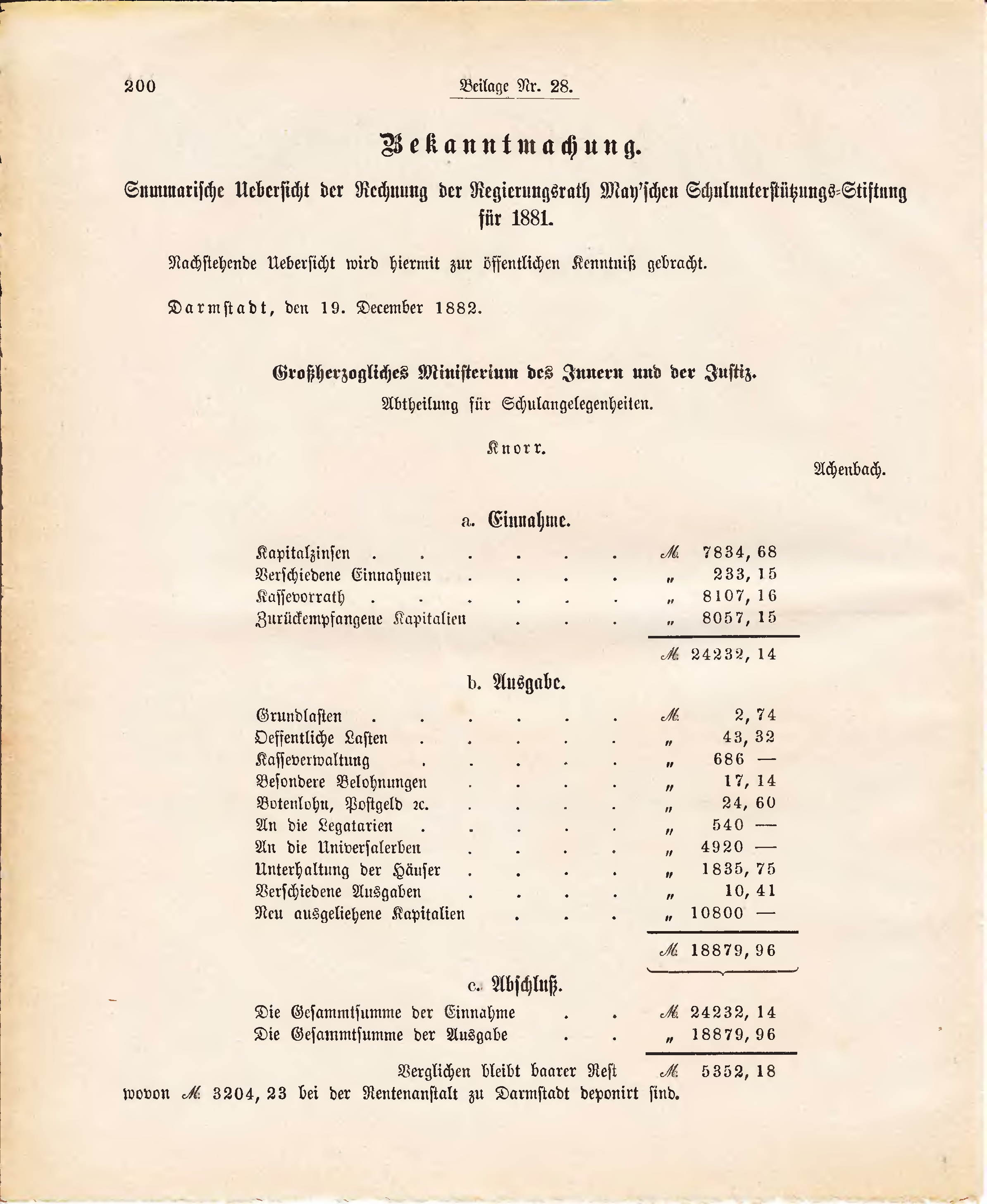 Summarische Uebersicht der Rechnung der Regierungsrath May`schen Schulunterstützungs-Stiftung für 1881.