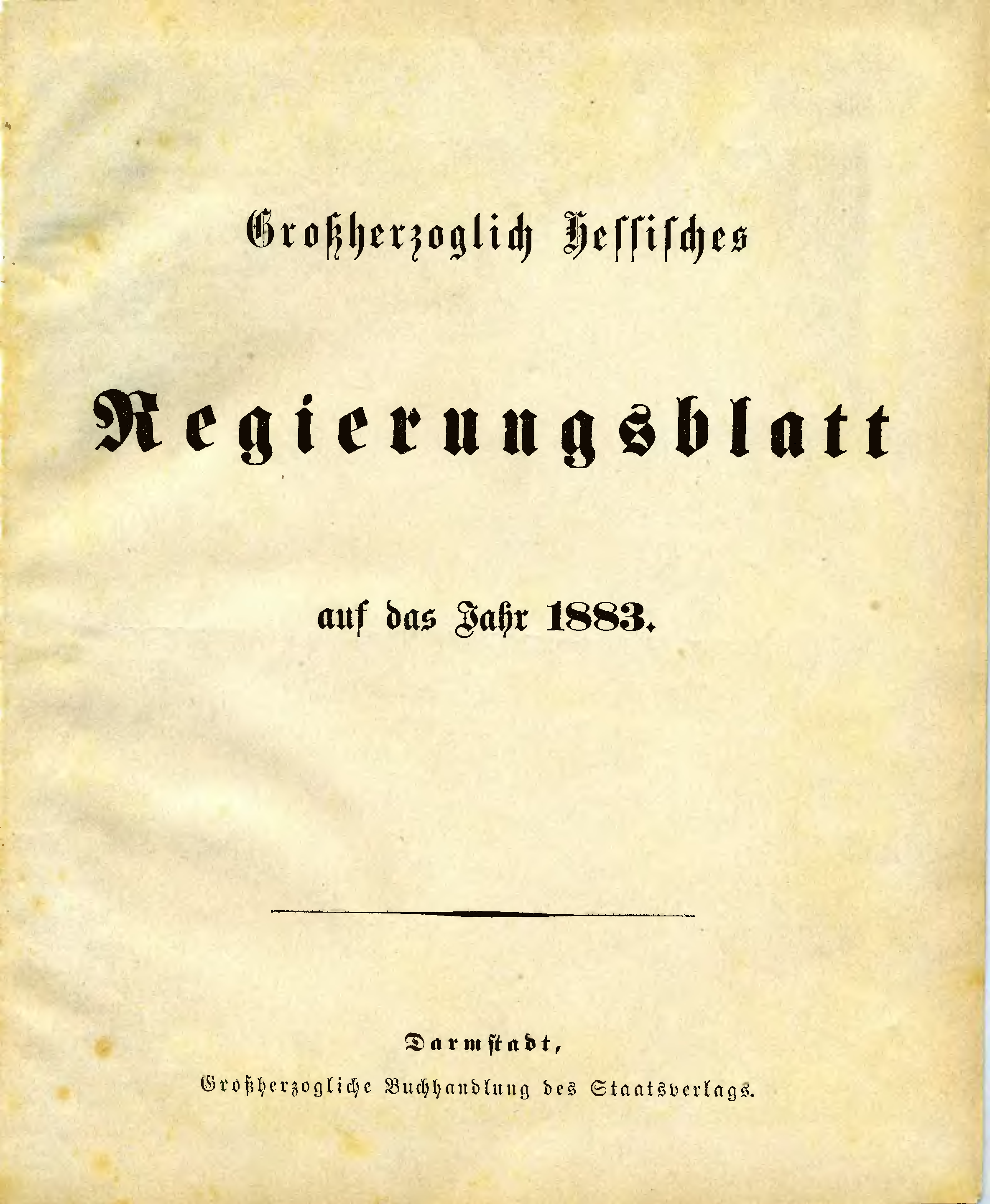 Großherzoglich Hessisches Regierungsblatt auf das Jahr 1883. Darmstadt: Großherzogliche Buchhandlung des Staatsverlags [1883].