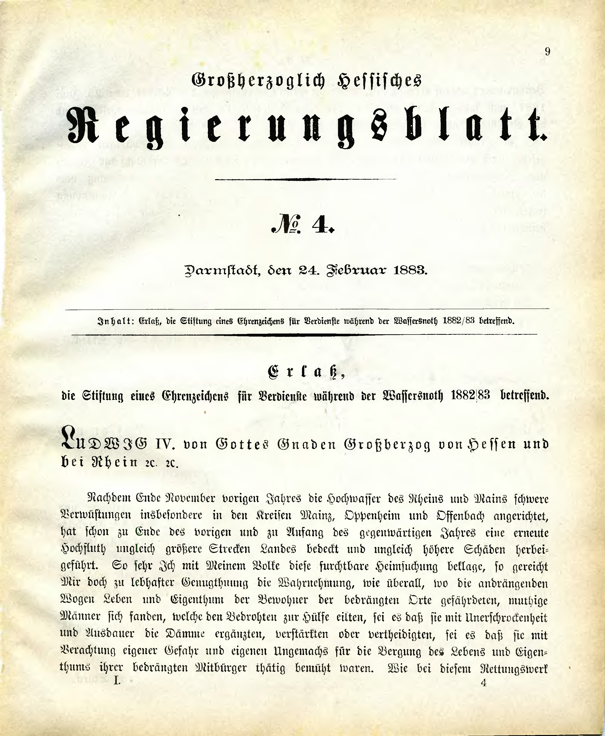 LUDWIG IV. von Gottes Gnaden Großherzog von Hessen und bei Rhein etc. etc. Nachdem Ende November vorigen Jahres die Hochwasser des Rheins und Mains schwere Verwüstungen insbesondere in den Kreisen Mainz, Oppenheim und Offenbach angerichtet, hat schon zu Ende des vorigen und zu Anfang des gegenwärtigen Jahres eine erneute Hochfluth ungleich größere Strecken Landes bedeckt und ungleich höhere Schäden herbeigeführt. So sehr Ich mit Meinem Volke diese furchtbare Heimsuchung beklage, so gereicht Mir doch zu lebhafter Genugthuung die Wahrnehmung, wie überall, wo die andrängenden Wogen Leben und Eigenthum der Bewohner der bedrängten Orte gefährdeten, muthige Männer sich fanden, welche den Bedrohten zur Hülfe eilten, sei es daß sie mit Unerschrockenheit und Ausdauer die Dämme ergänzten, verstärkten oder vertheidigten, sei es daß sie mit Verachtung eigener Gefahr und eigenen Ungemachs für die Bergung des Lebens und Eigenthums ihrer bedrängten Mitbürger thätig bemüht waren. Wie bei diesem Rettungswerk