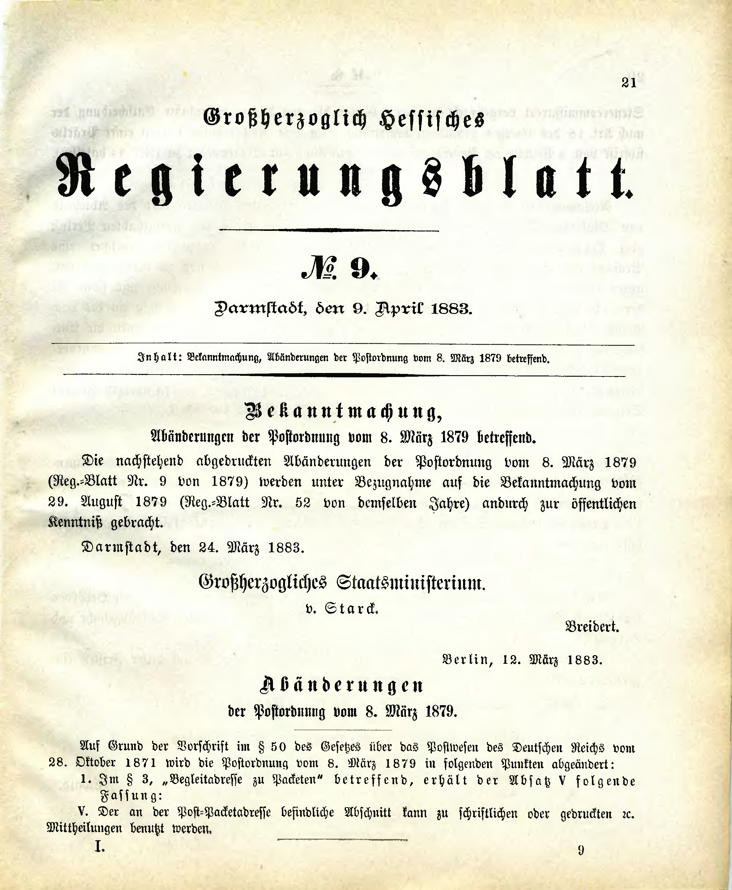 Die nachstehend abgedruckten Abänderungen der Postordnung vom 8. März 1879 (Reg.-Blatt Nr. 9 von 1879) werden unter Bezugnahme auf die Bekanntmachung vom 29. August 1879 (Reg.-Blatt Nr. 52 von demselben Jahre) andurch zur öffentlichen Kenntniß gebracht. Darmstadt, den 24. März 1883.