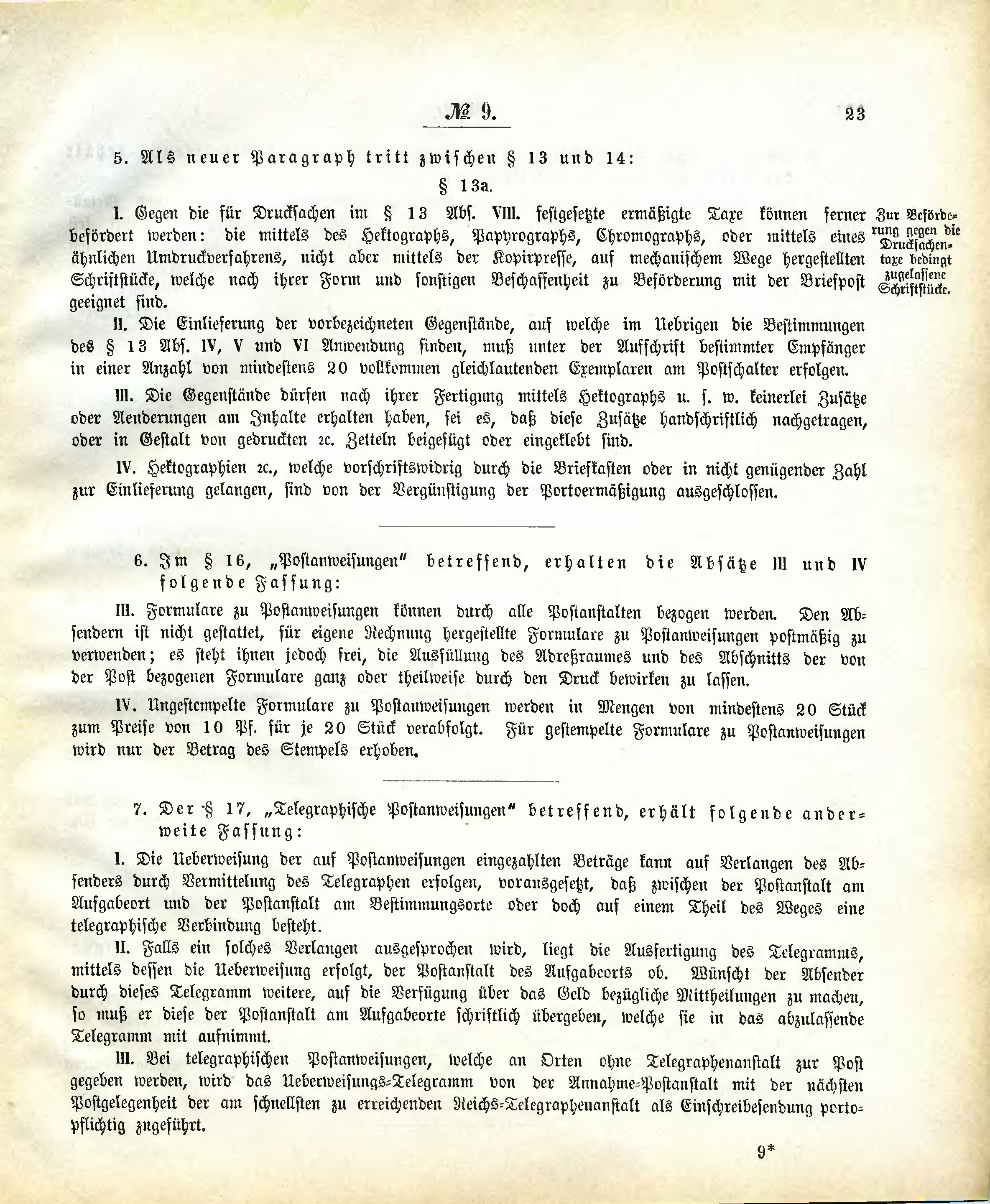 | I. Gegen die für Drucksachen im § 13 Abs. VIII. festgesetzte ermäßigte Taxe können ferner befördert werden: die mittels des Hektographs, Papyrographs, Chromographs, oder mittels eines ähnlichen Umdruckverfahrens, nicht aber mittels der Kopirpresse, auf mechanischem Wege hergestellten Schriftstücke, welche nach ihrer Form und sonstigen Beschaffenheit zu Beförderung mit der Briefpost geeignet sind. | Zur Beförderung gegen die Drucksachentaxe bedingt zugelassene Schriftstücke. |
